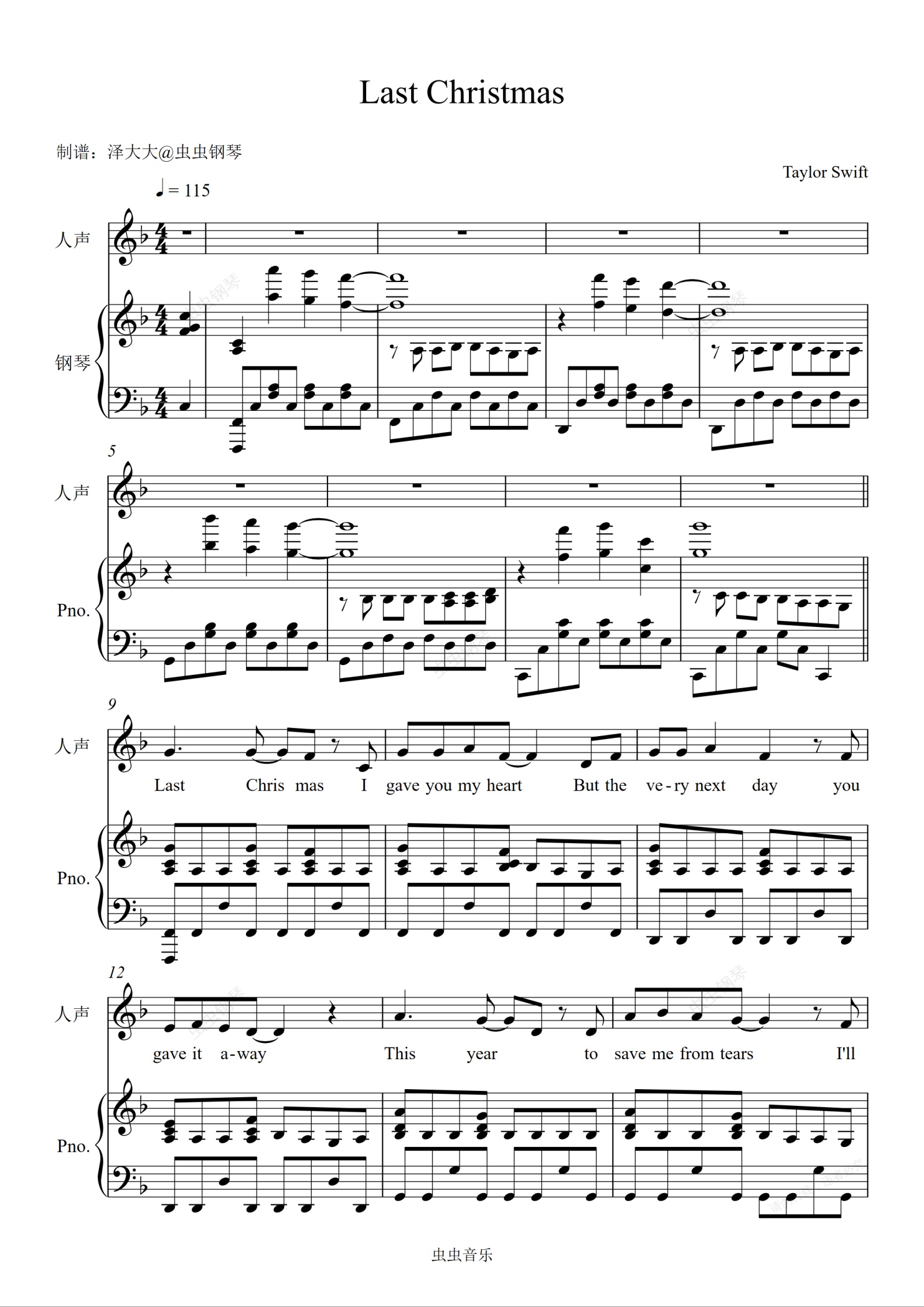 钢琴谱:Last Christmas【原版弹唱附词】圣诞歌 泽大大 Taylor Swift