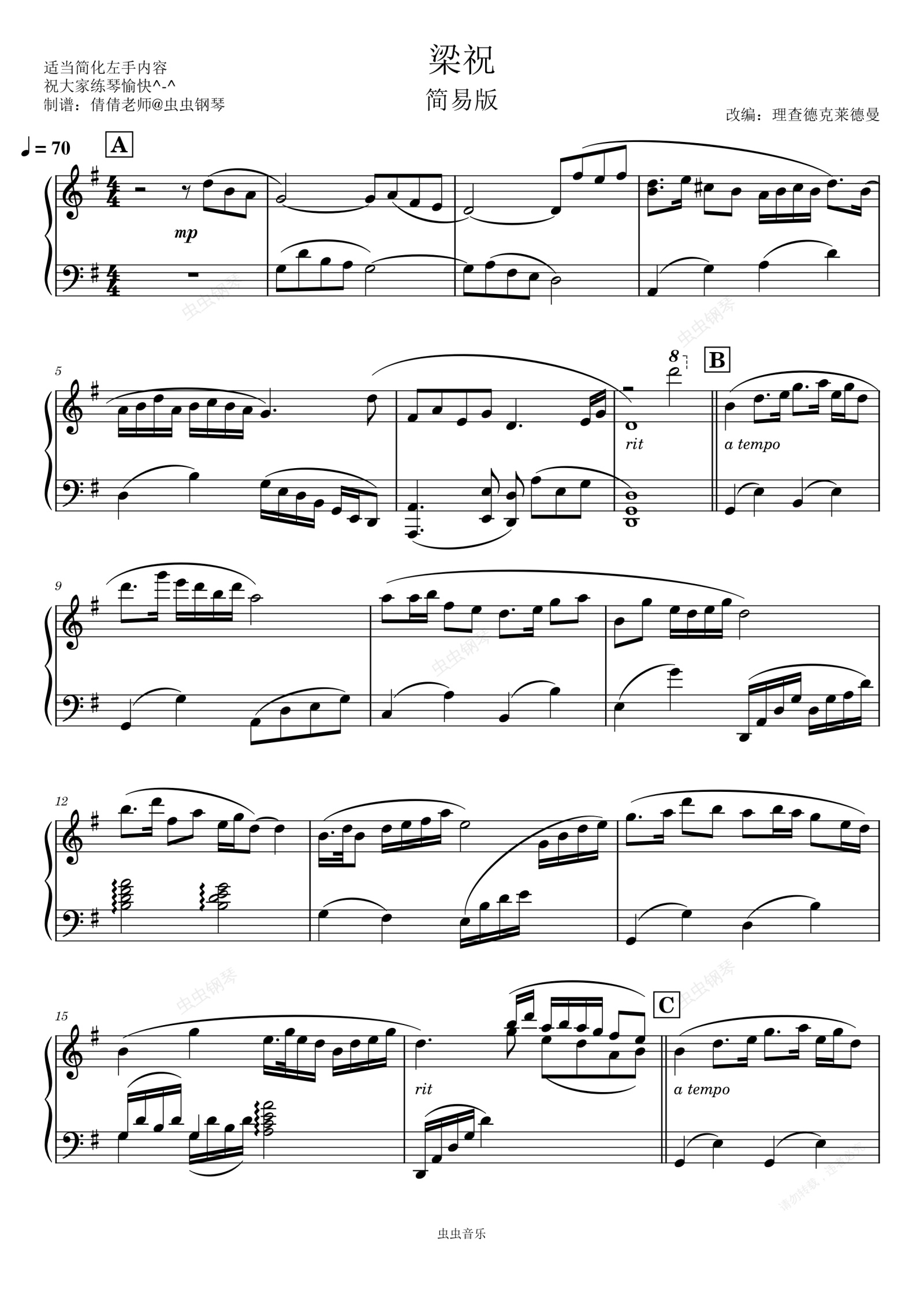 钢琴谱:梁祝-原调简易版-理查德克莱德曼改编