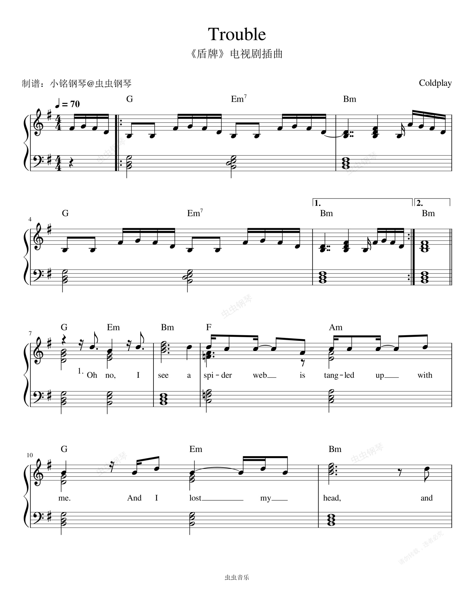 钢琴谱:Trouble - 电视剧《盾牌》插曲