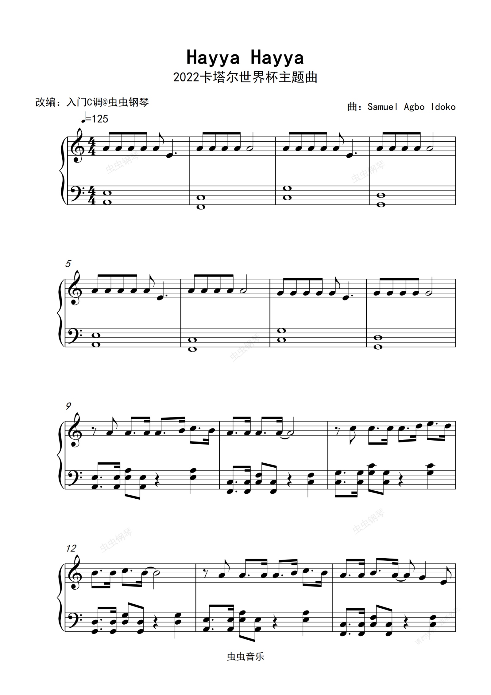 钢琴谱:2022卡塔尔世界杯主题曲《Hayya Hayya》入门C调简单版