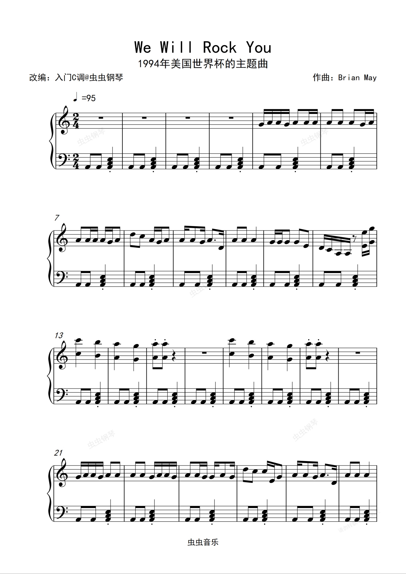 钢琴谱:1994年美国世界杯的主题曲《We Will Rock You》入门C调简单版