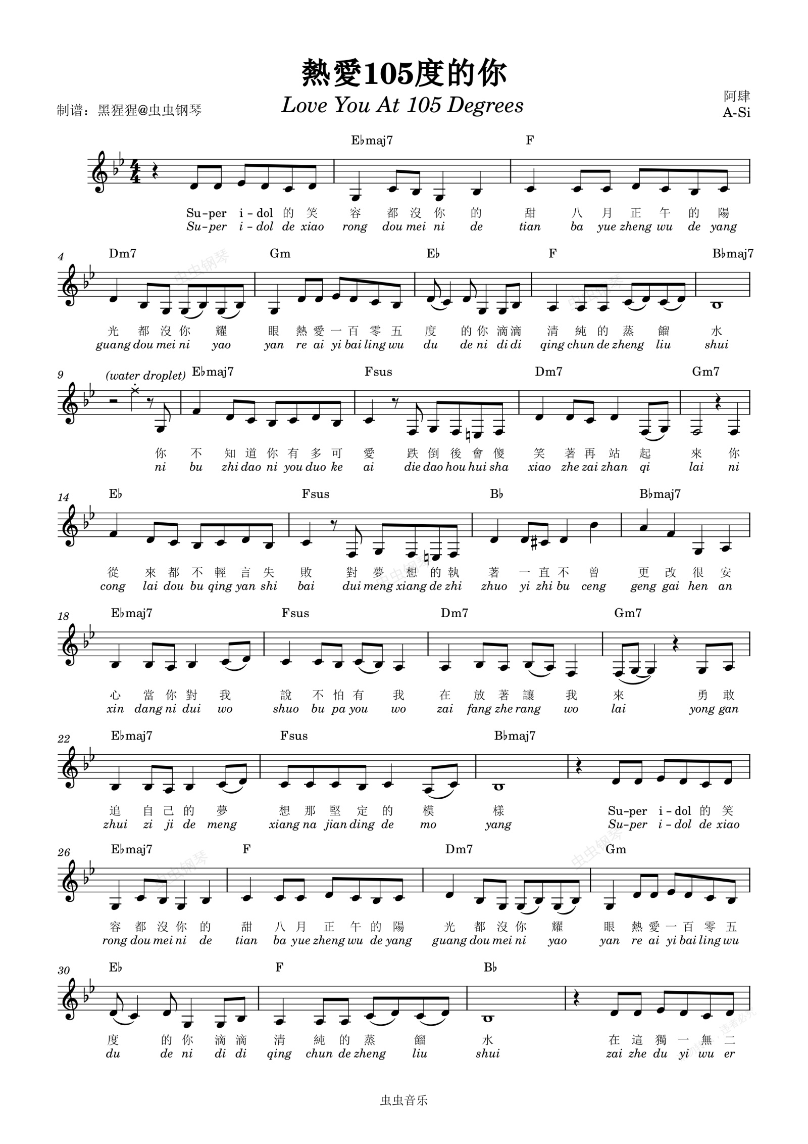钢琴谱:阿肆-Bb调 《热爱105度的你》【带歌词】