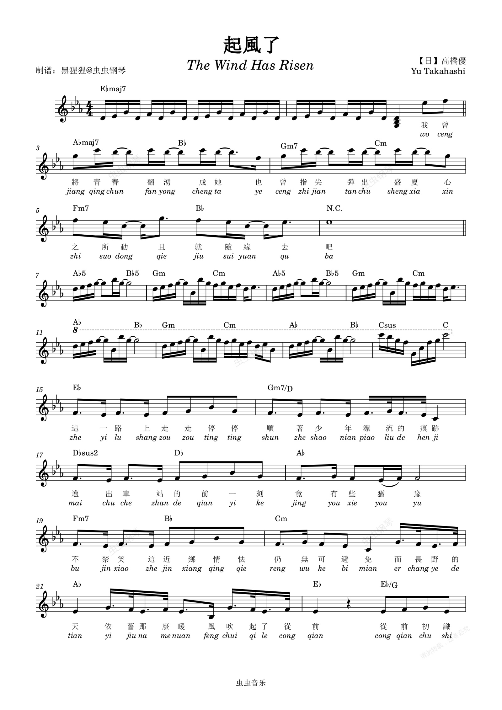 钢琴谱:吴青峰-Eb调 《起风了》【带歌词】