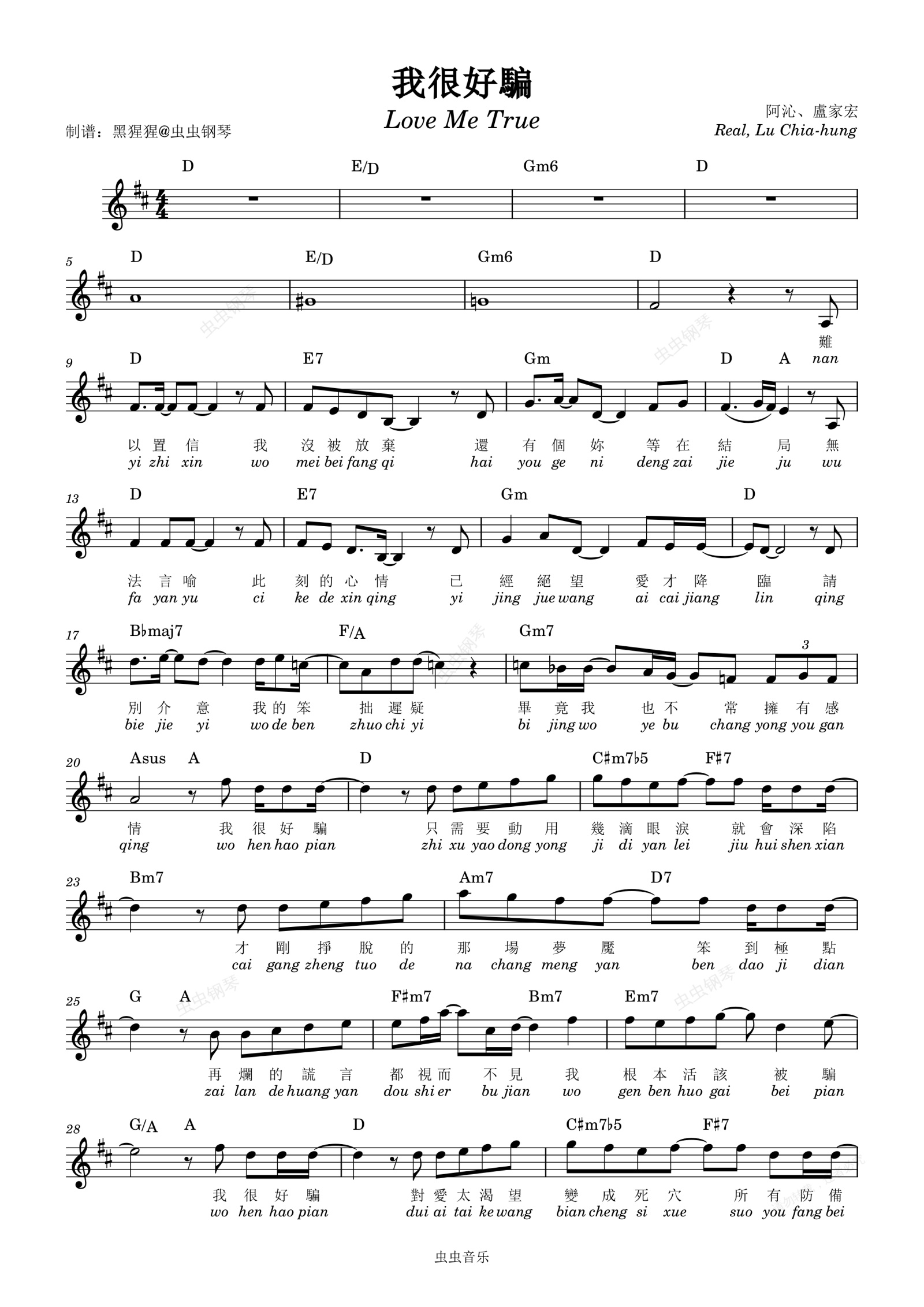 钢琴谱:动力火车-D调 《我很好骗》【带歌词】