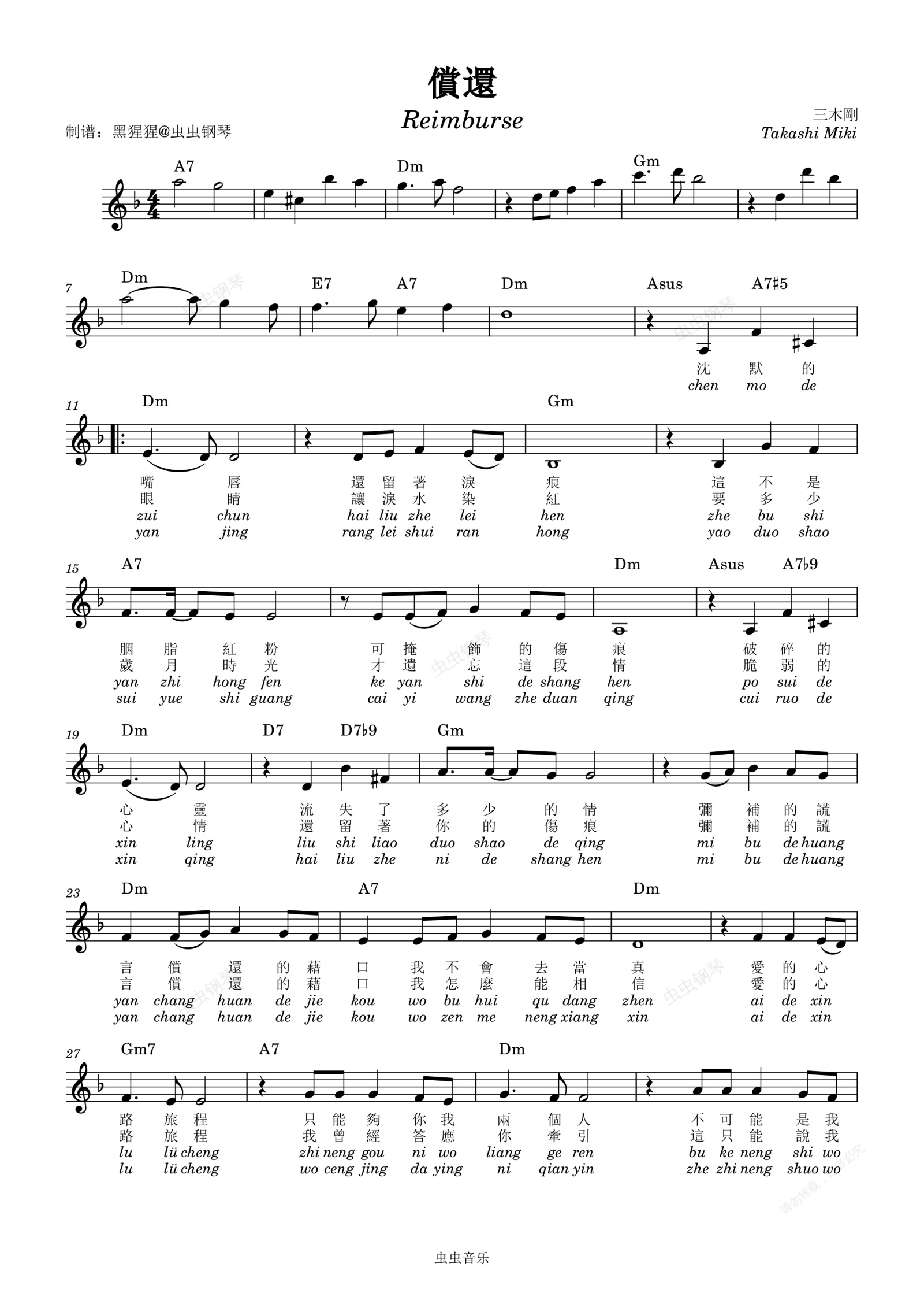 钢琴谱:邓丽君-F调 《偿还》【带歌词】