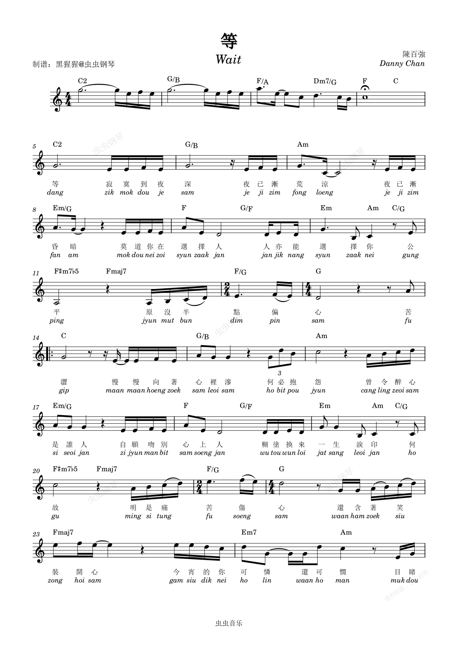 钢琴谱:陈百强-C调 《等》【带歌词】