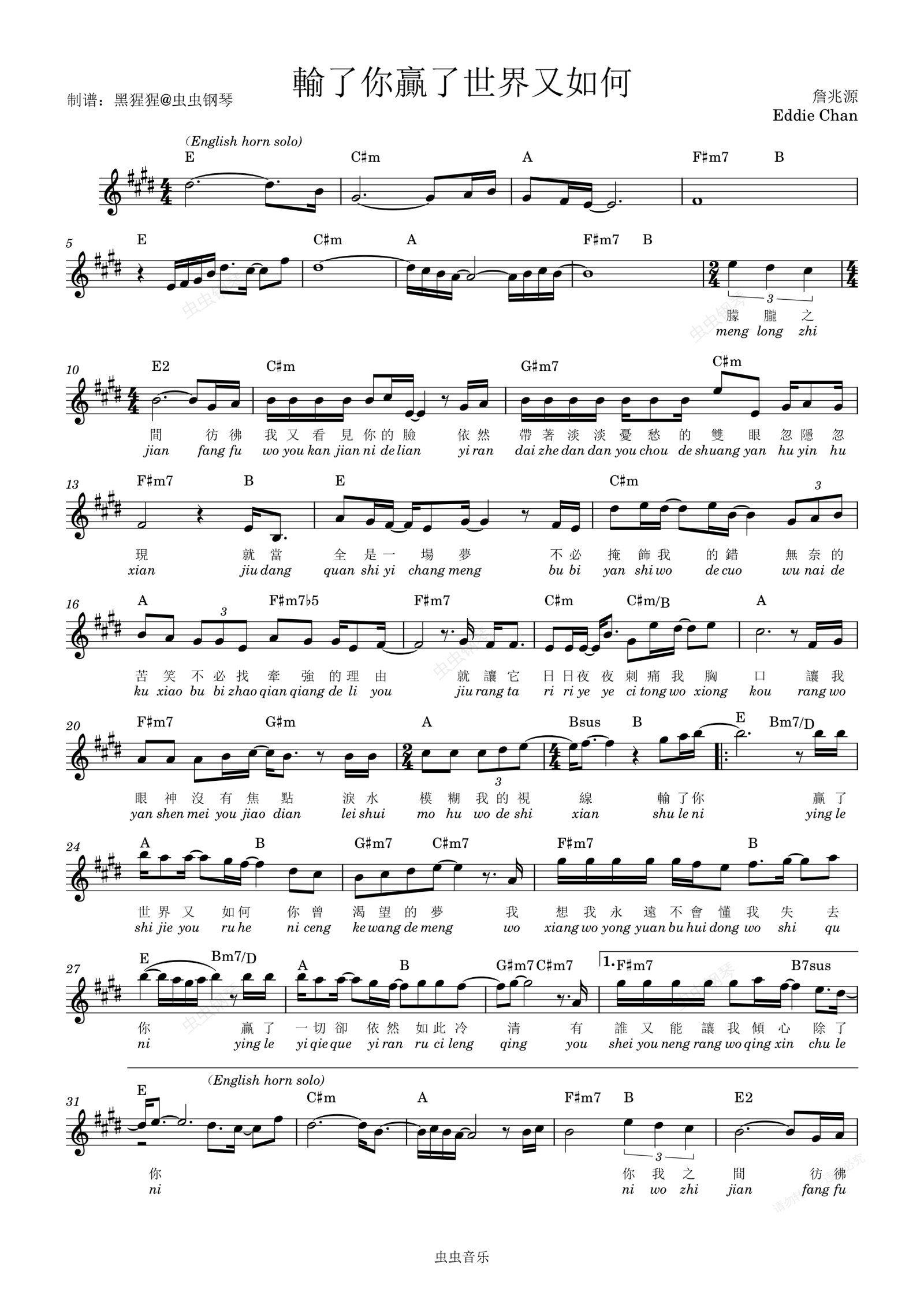 钢琴谱:优客李林-E调 《输了你赢了世界又如何》【带歌词】