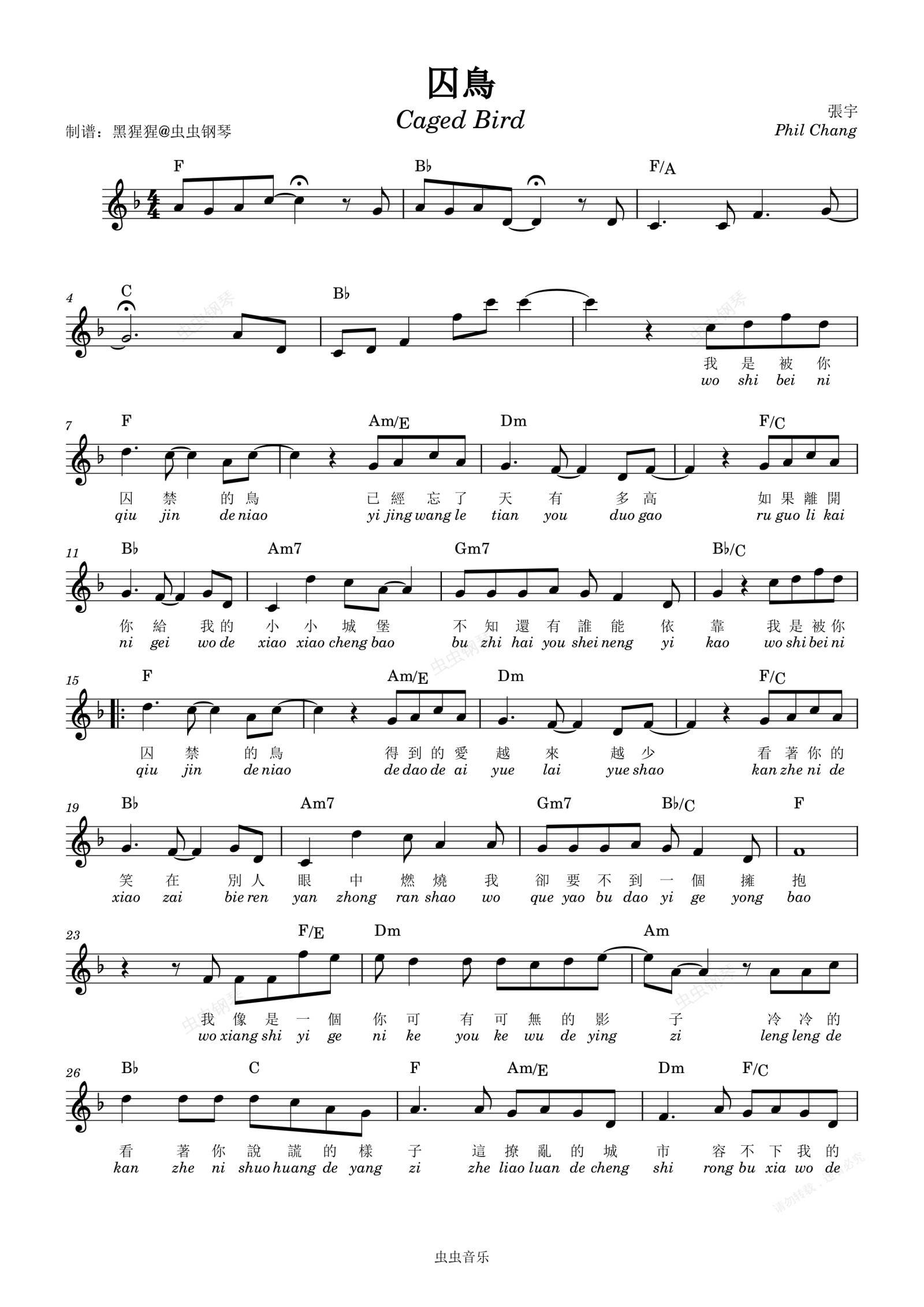 钢琴谱:张宇-F调 《囚鸟》【带歌词】