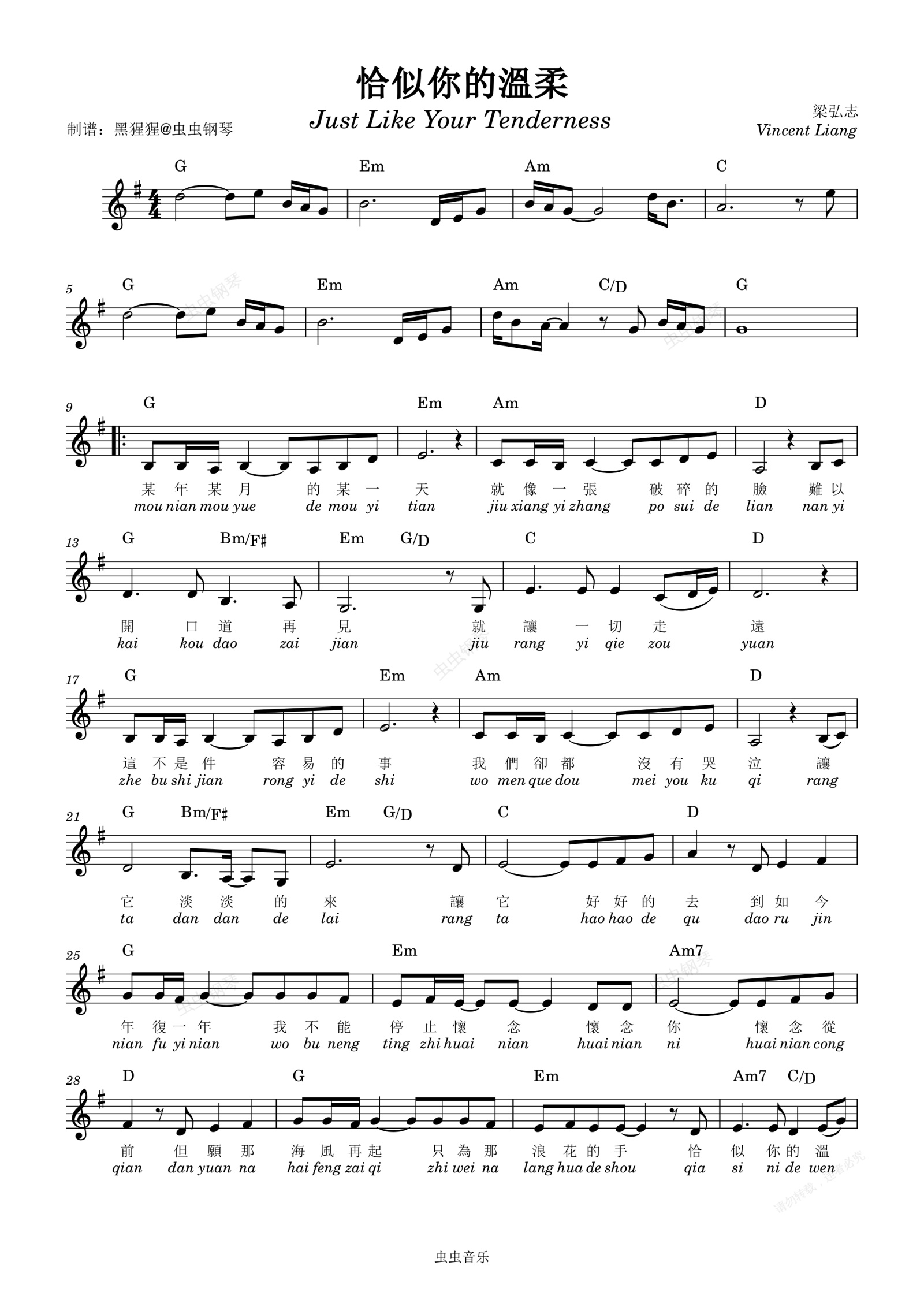 钢琴谱:蔡琴-G调 《恰似你的温柔》【带歌词】