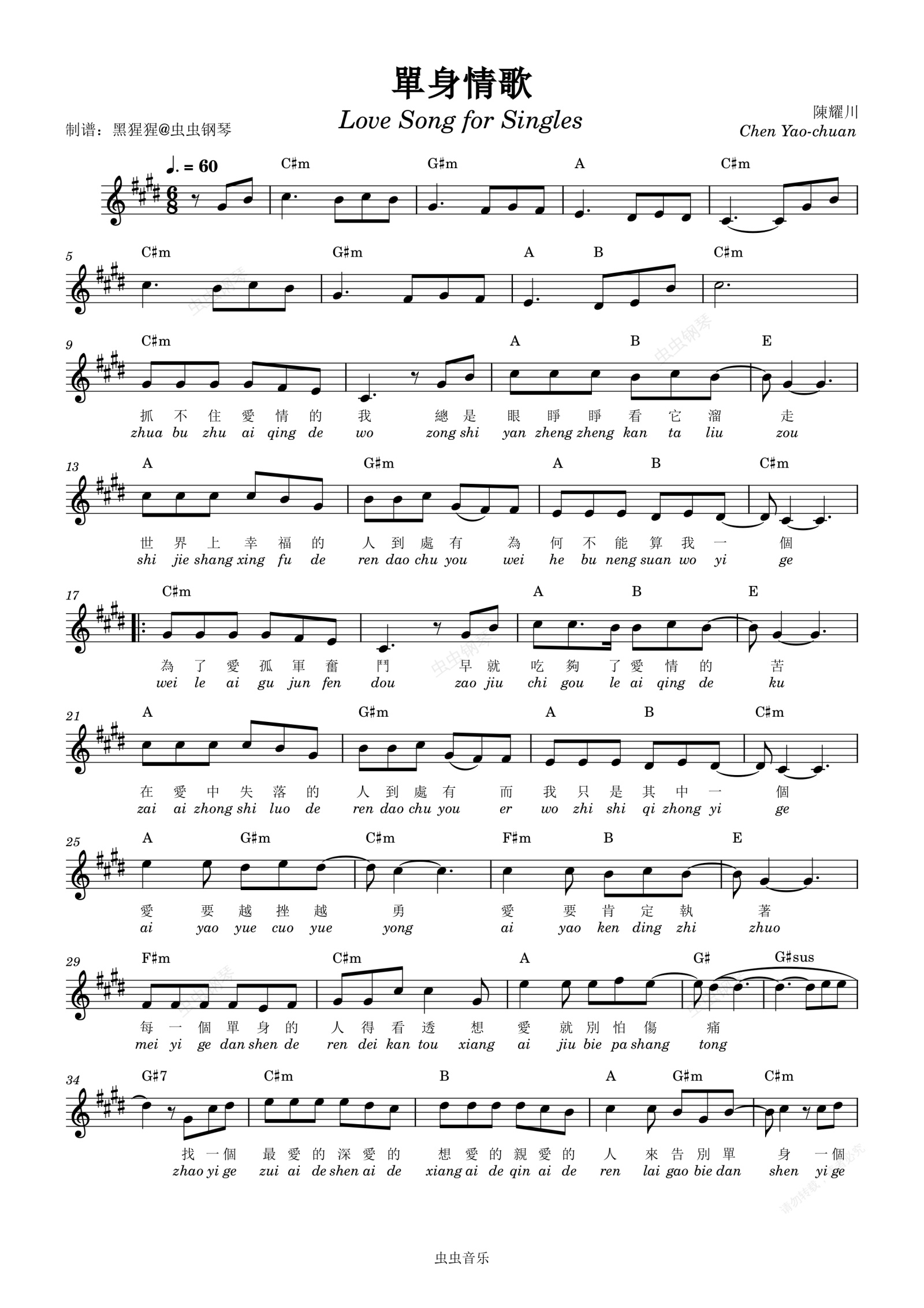 钢琴谱:林志炫-E调 《单身情歌》【带歌词】