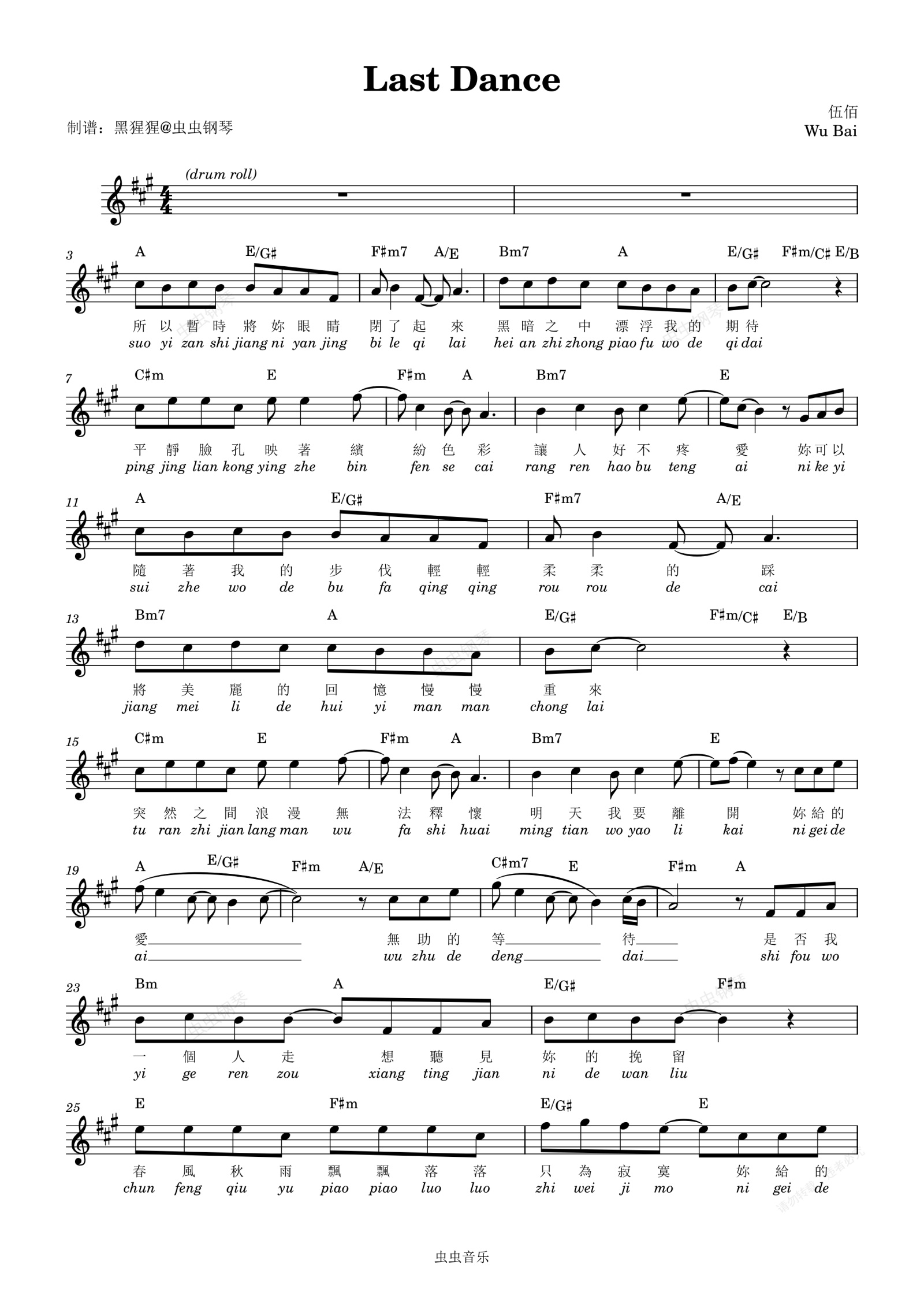 钢琴谱:伍佰-A调 《Last Dance》【带歌词】