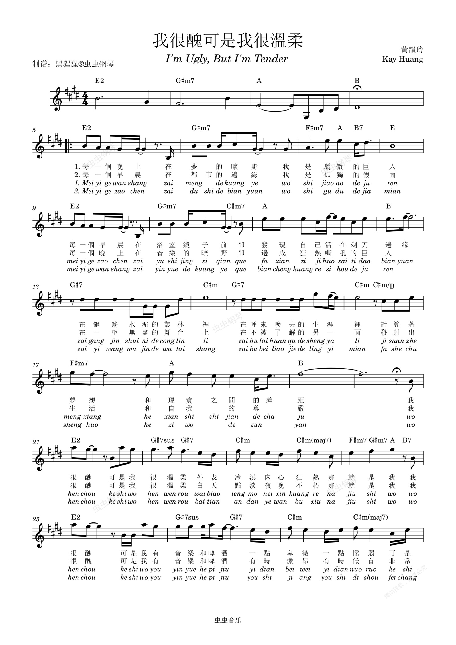 钢琴谱:赵传-E调 《我很丑可是我很温柔》【带歌词】