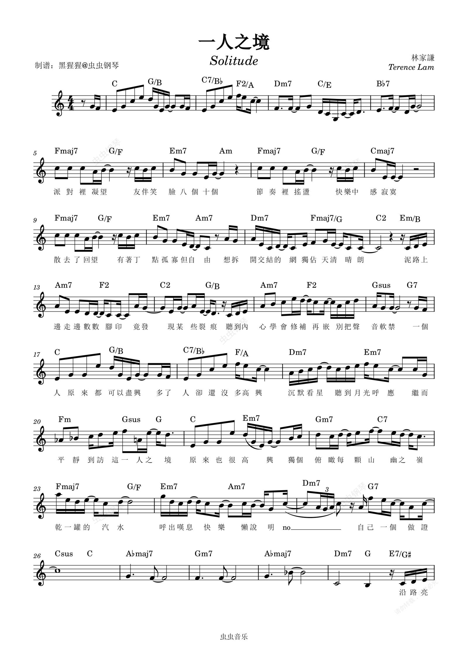钢琴谱:林家谦-C调 《一人之境》【带歌词】