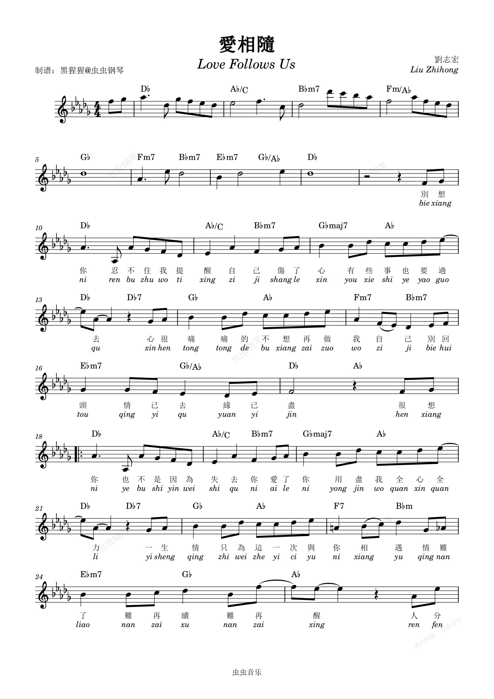 钢琴谱:周华健-Db调 《爱相随》【带歌词】