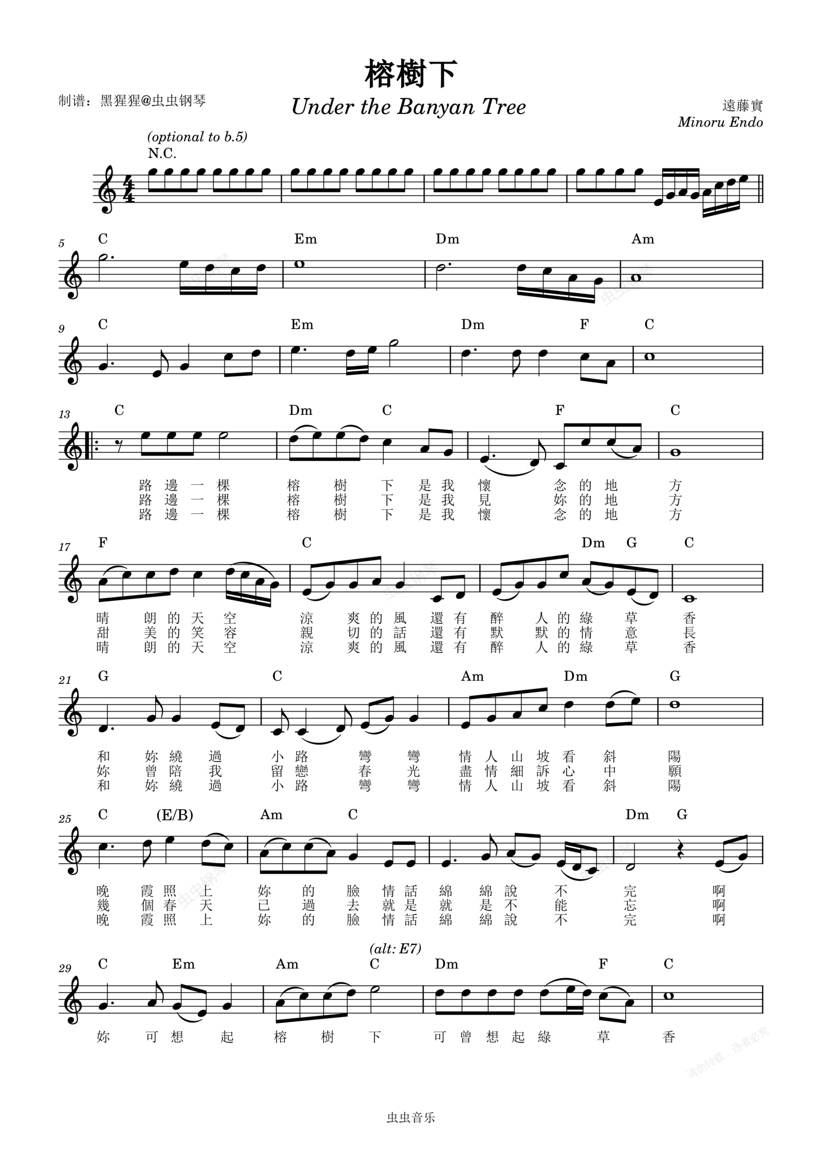 钢琴谱:余天-C调 《榕树下》【带歌词】