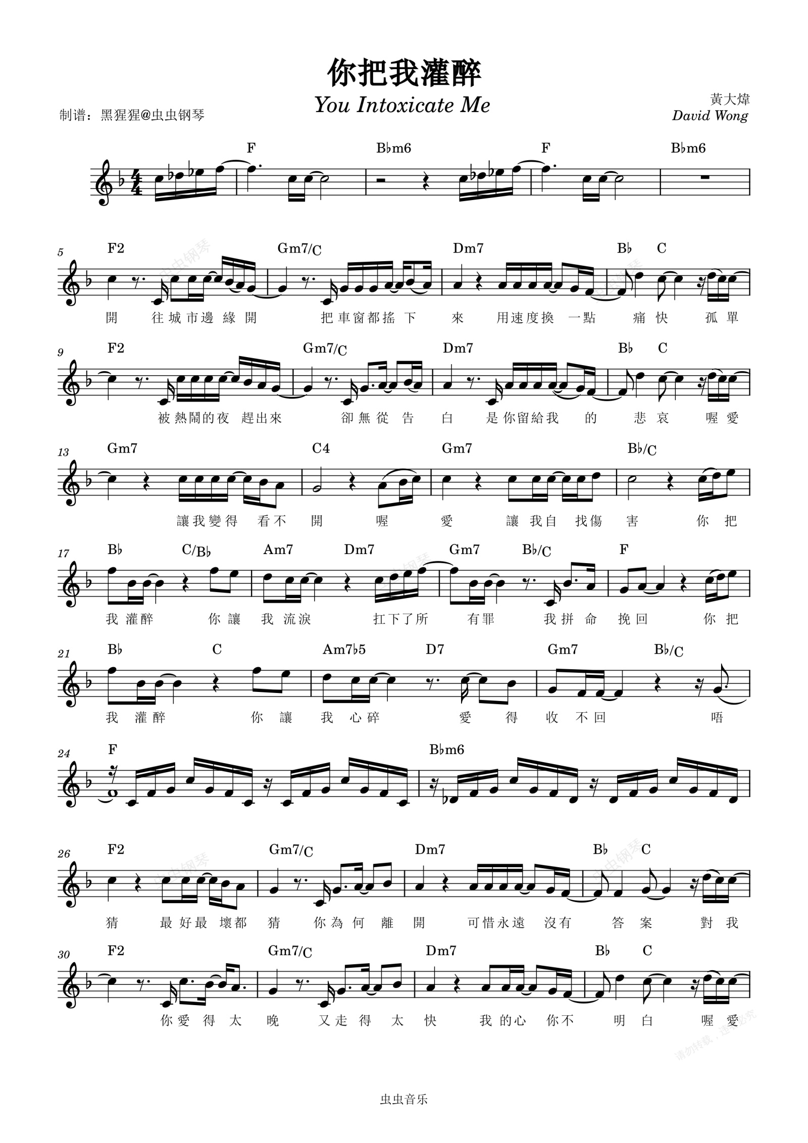 钢琴谱:黄大炜-F调 《你把我灌醉》【带歌词】