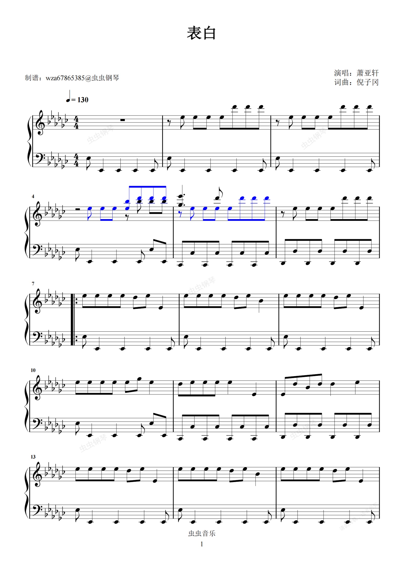钢琴谱:表白 (独奏)