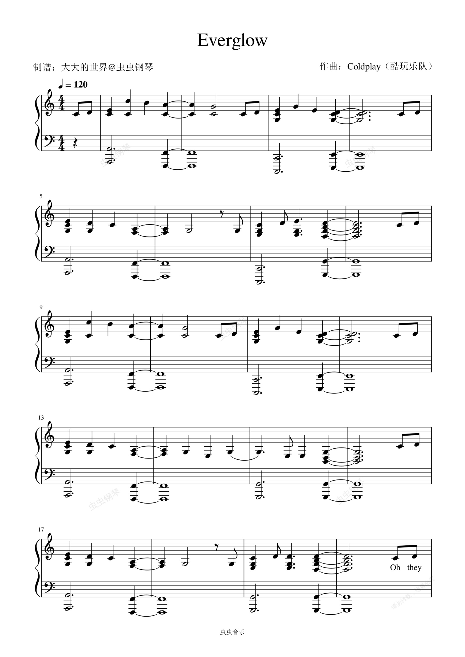 钢琴谱:Everglow - Coldplay(独奏C调带歌词)