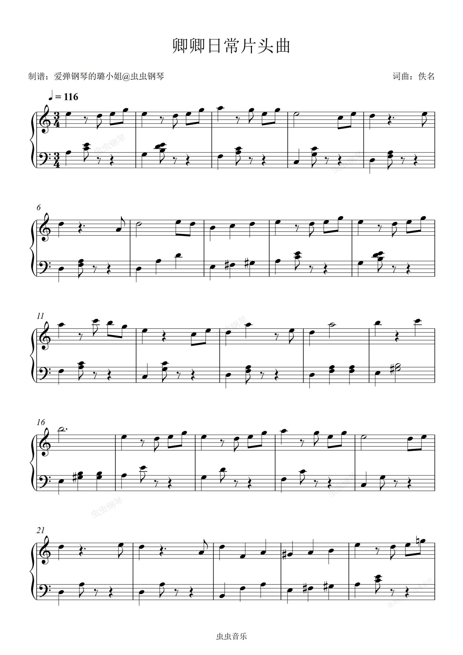 钢琴谱:卿卿日常片头曲 - 纯音乐 - C调简易版