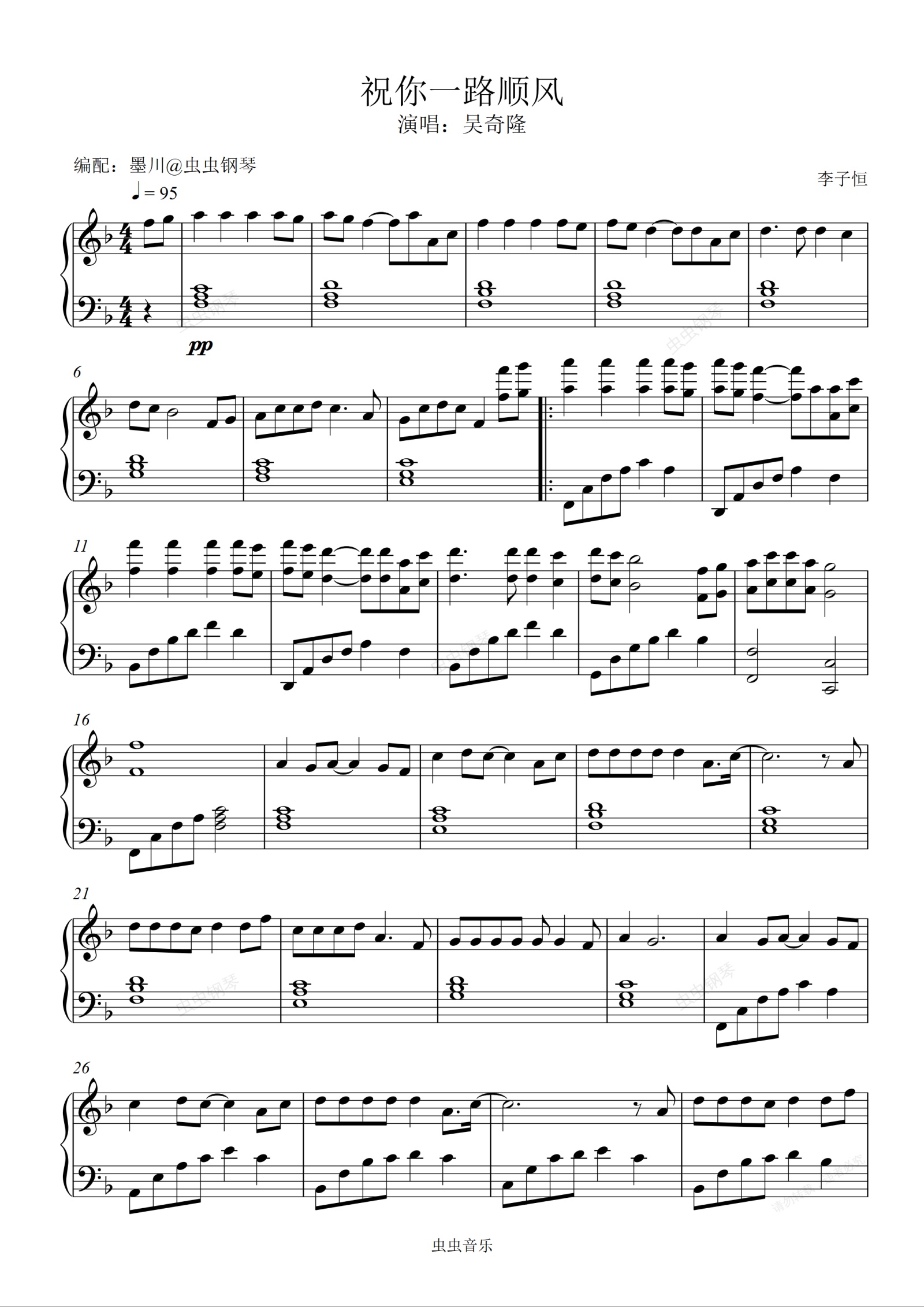 钢琴谱:祝你一路顺风—吴奇隆—F调编配