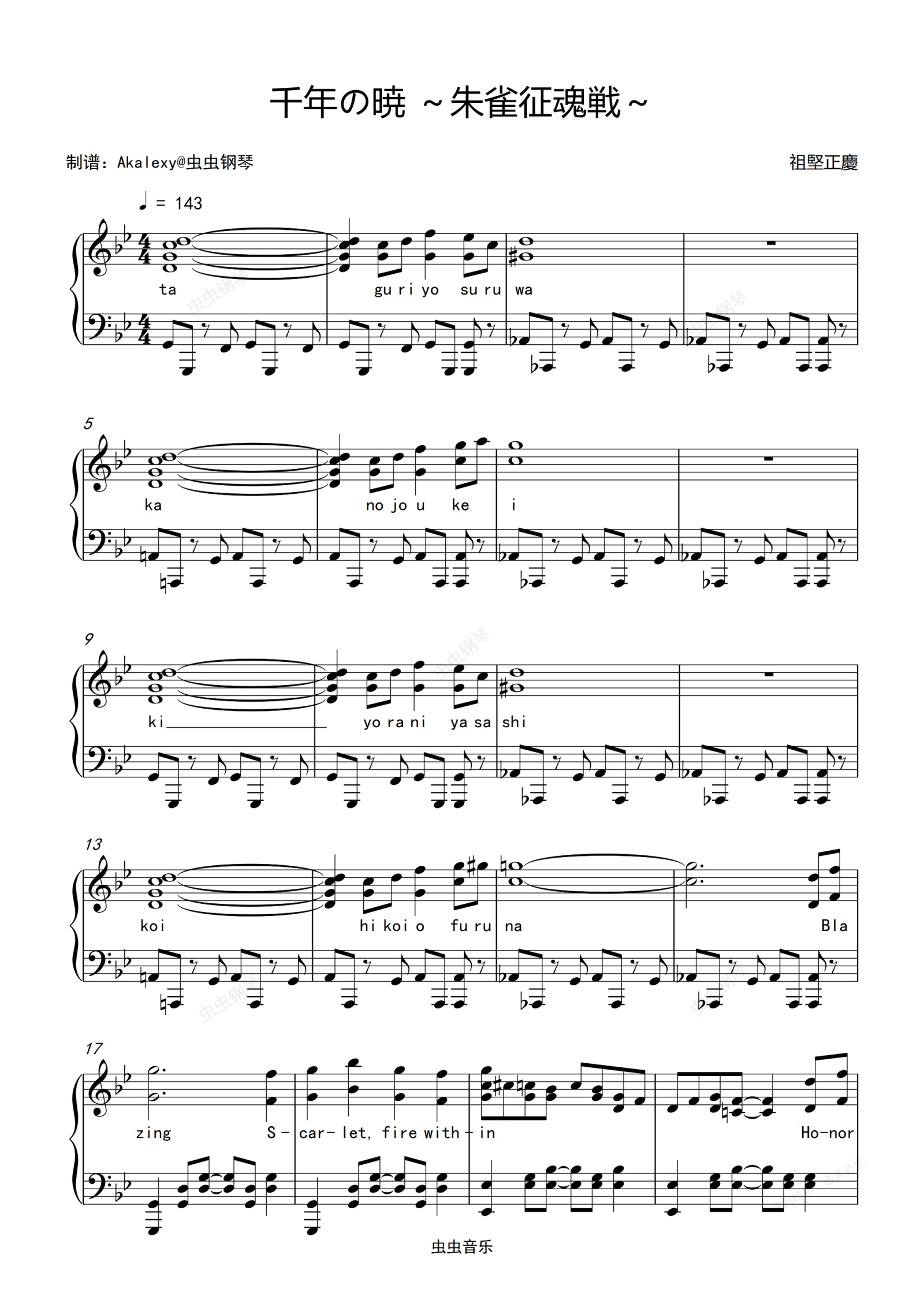 钢琴谱:千年の暁 ~朱雀征魂戦~(日语弹唱版)