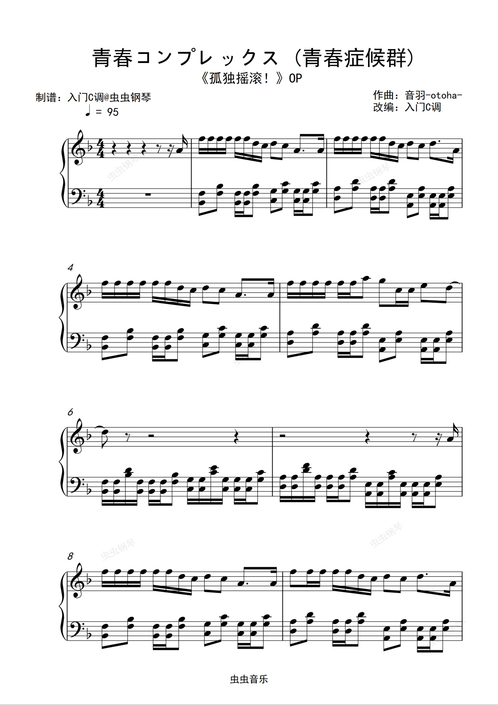 钢琴谱:《孤独摇滚!》OP《青春コンプレックス (青春症候群)》原调简单版