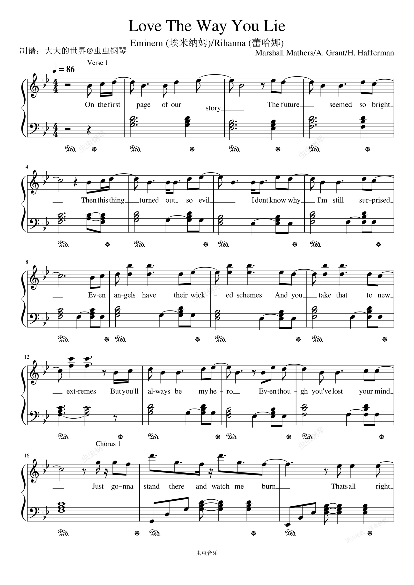 钢琴谱:Love The Way You Lie (Explicit)【独奏带歌词】 - Eminem (埃米纳姆)/Rihanna (蕾哈娜)