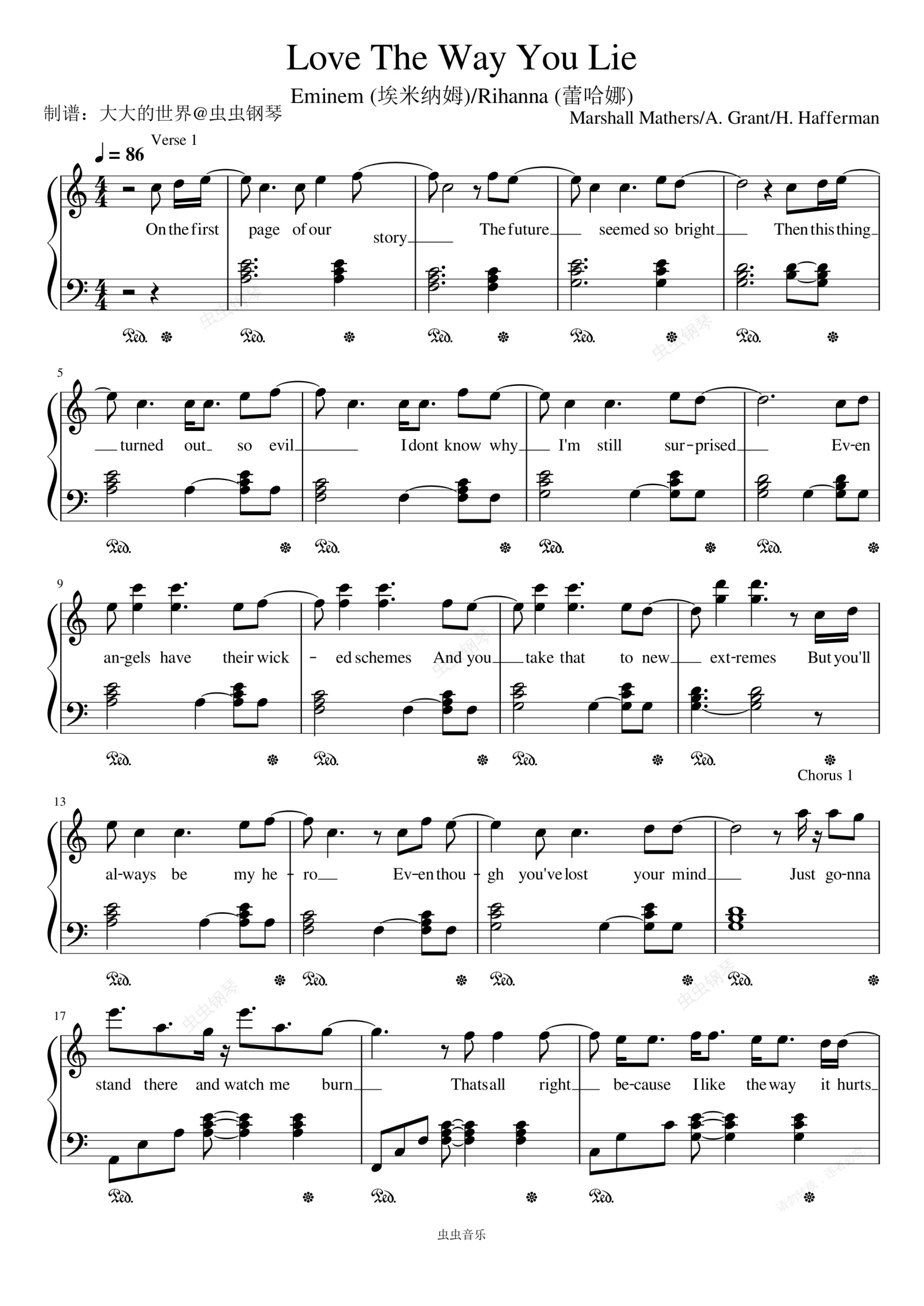钢琴谱:Love The Way You Lie (Explicit) 【独奏C调带歌词】- Eminem (埃米纳姆)/Rihanna (蕾哈娜)
