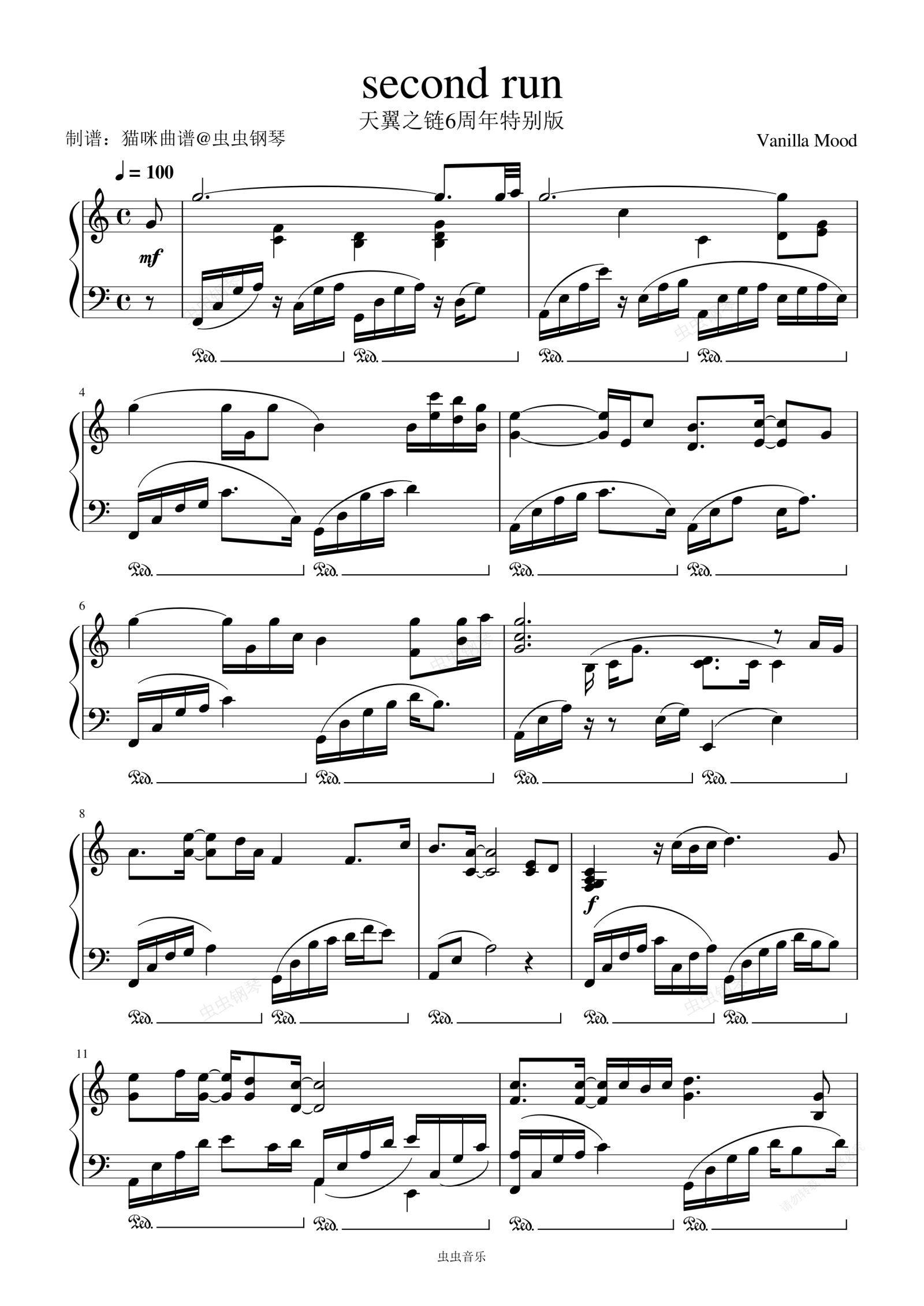 钢琴谱:second run(天翼之链6周年特别版)【C调】