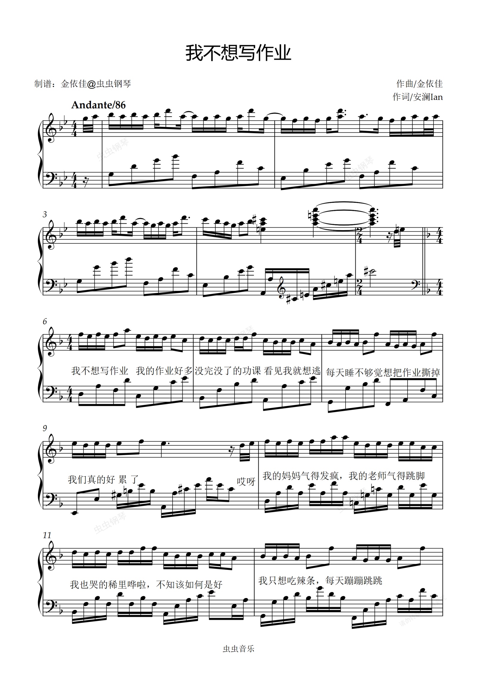 钢琴谱:我不想写作业