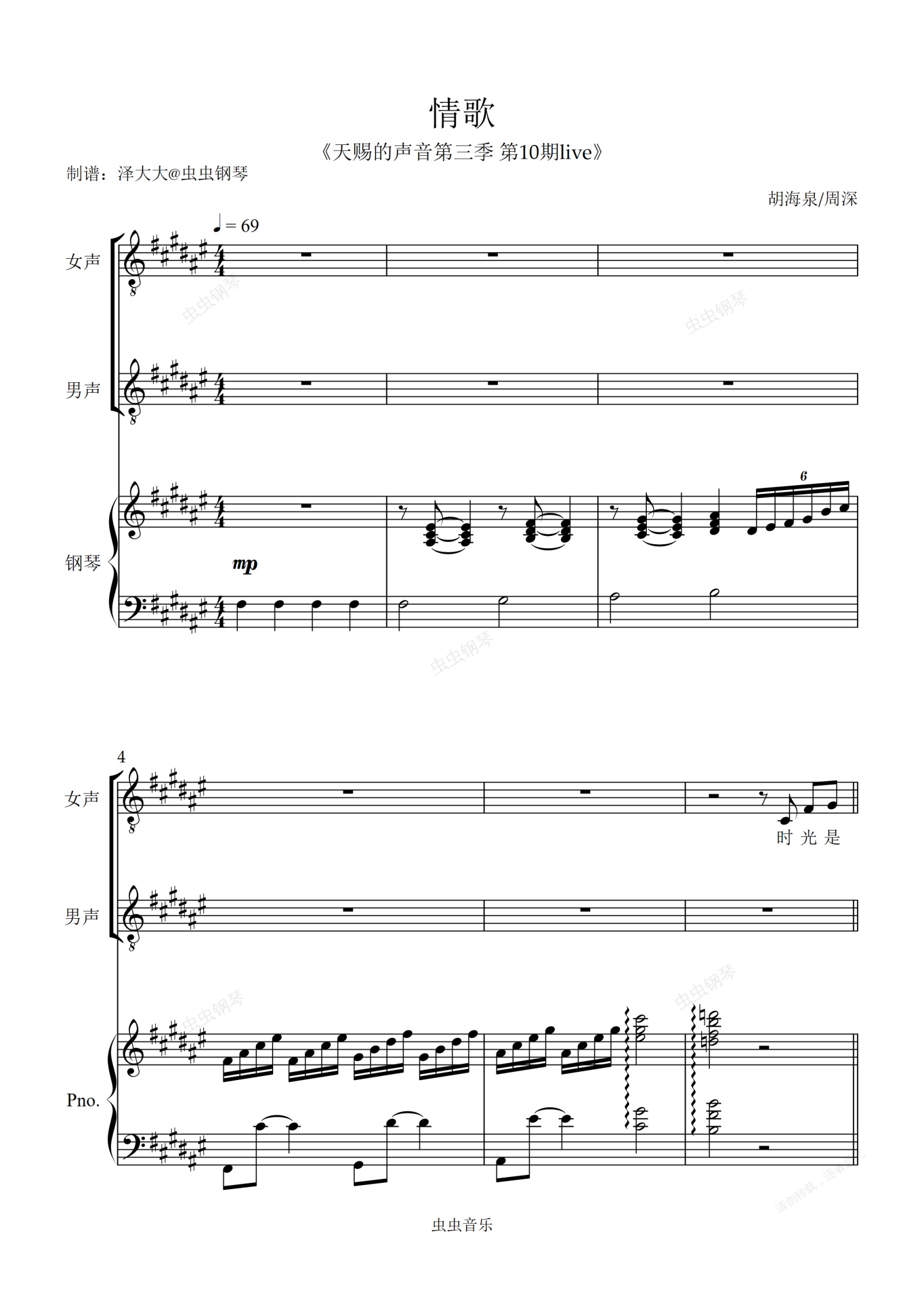 钢琴谱:情歌【天赐的声音Live弹唱附词】泽大大 周深/胡海泉
