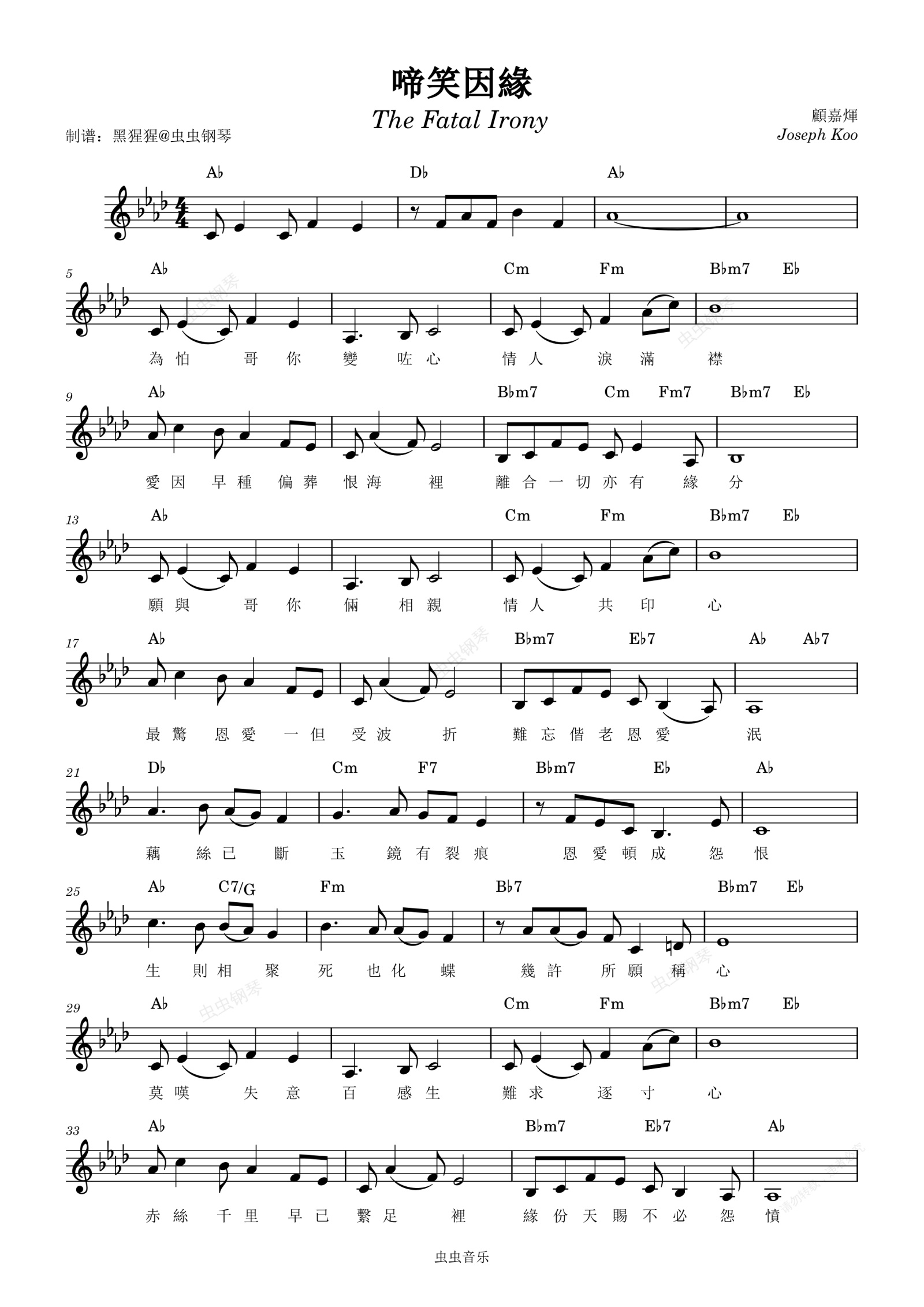 钢琴谱:仙杜拉-Ab调 《啼笑因缘》【带歌词】