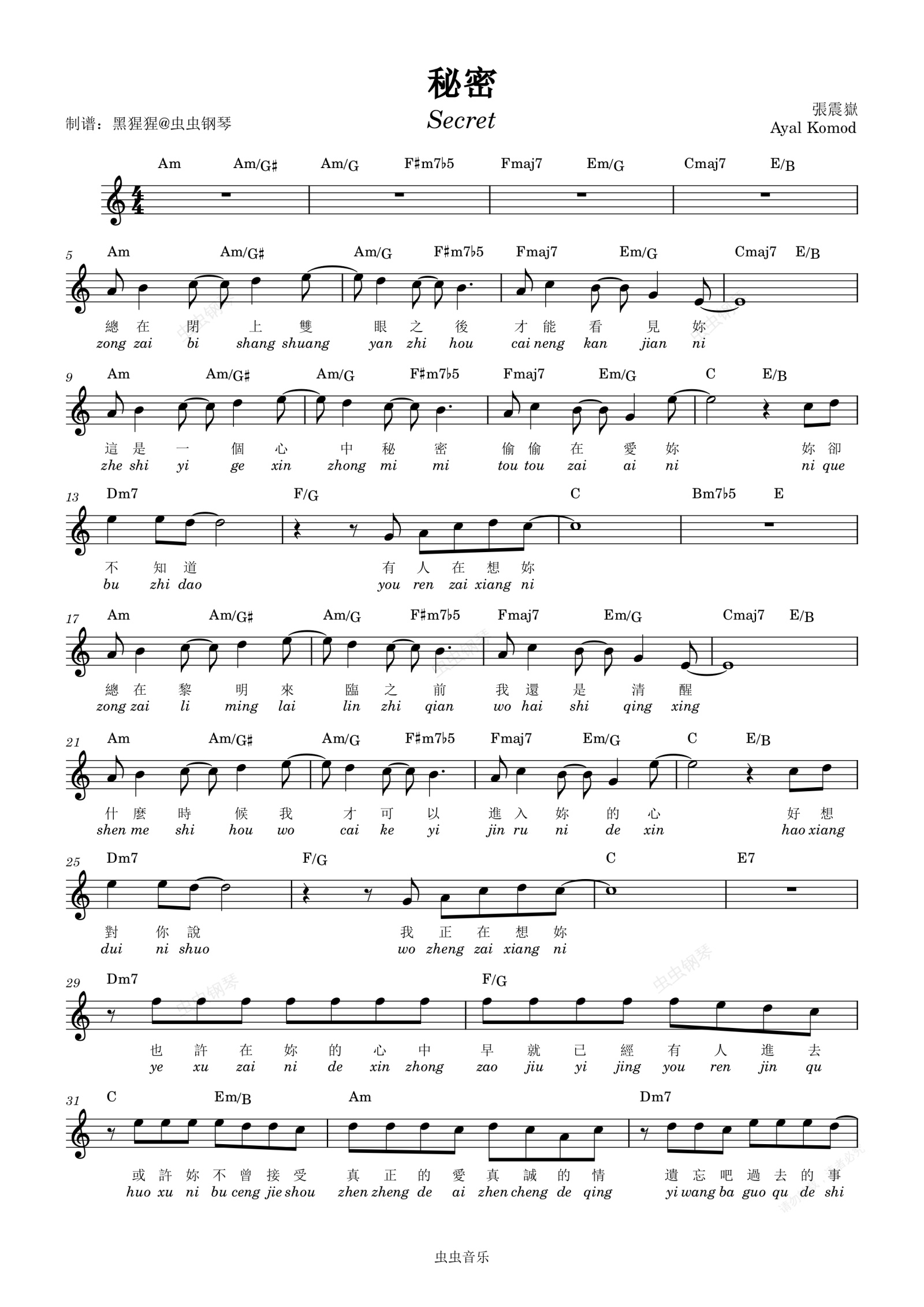 钢琴谱:張震嶽-C调 《秘密》【带歌词】