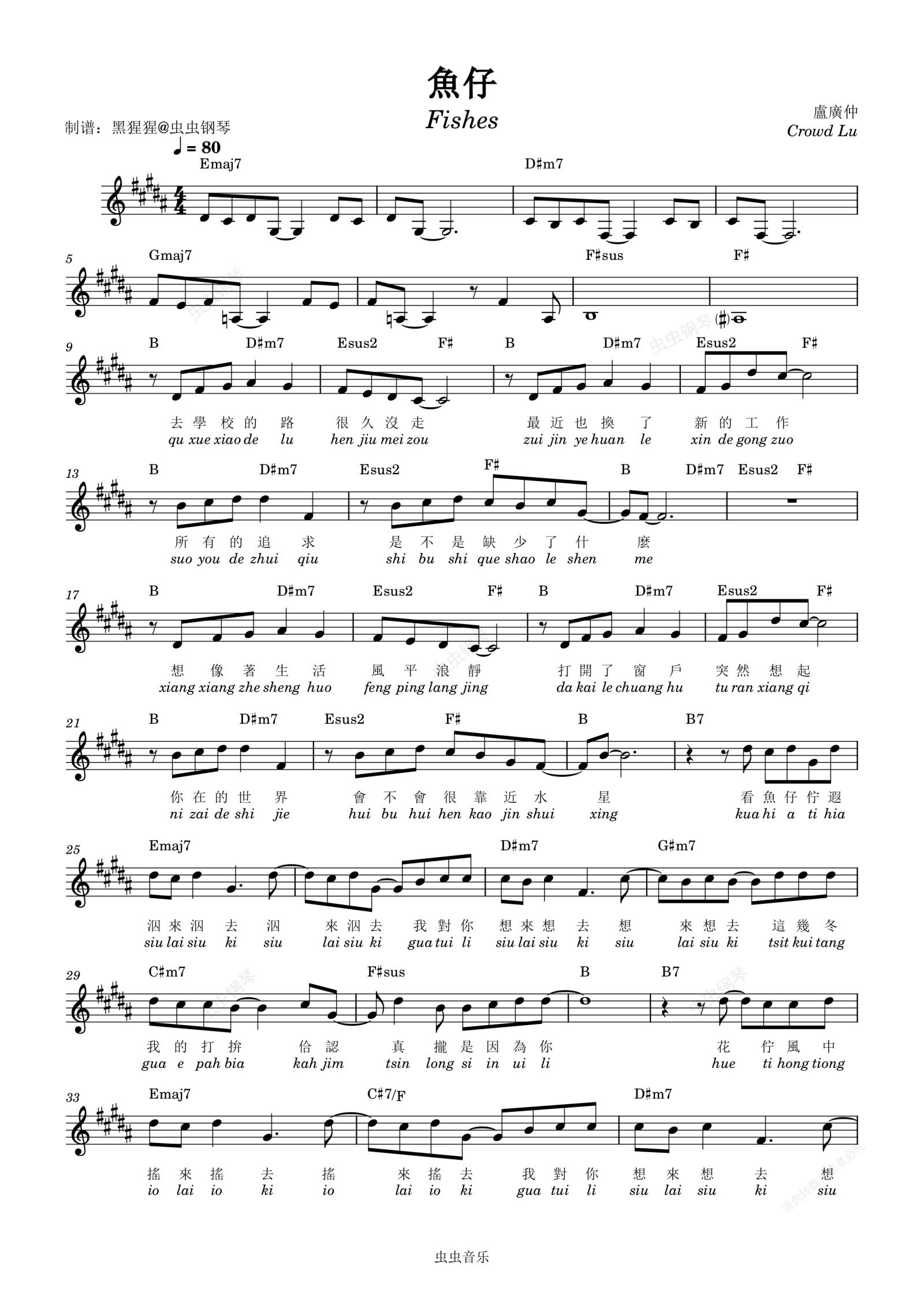 钢琴谱:卢广仲-B调 《鱼仔》【带歌词】