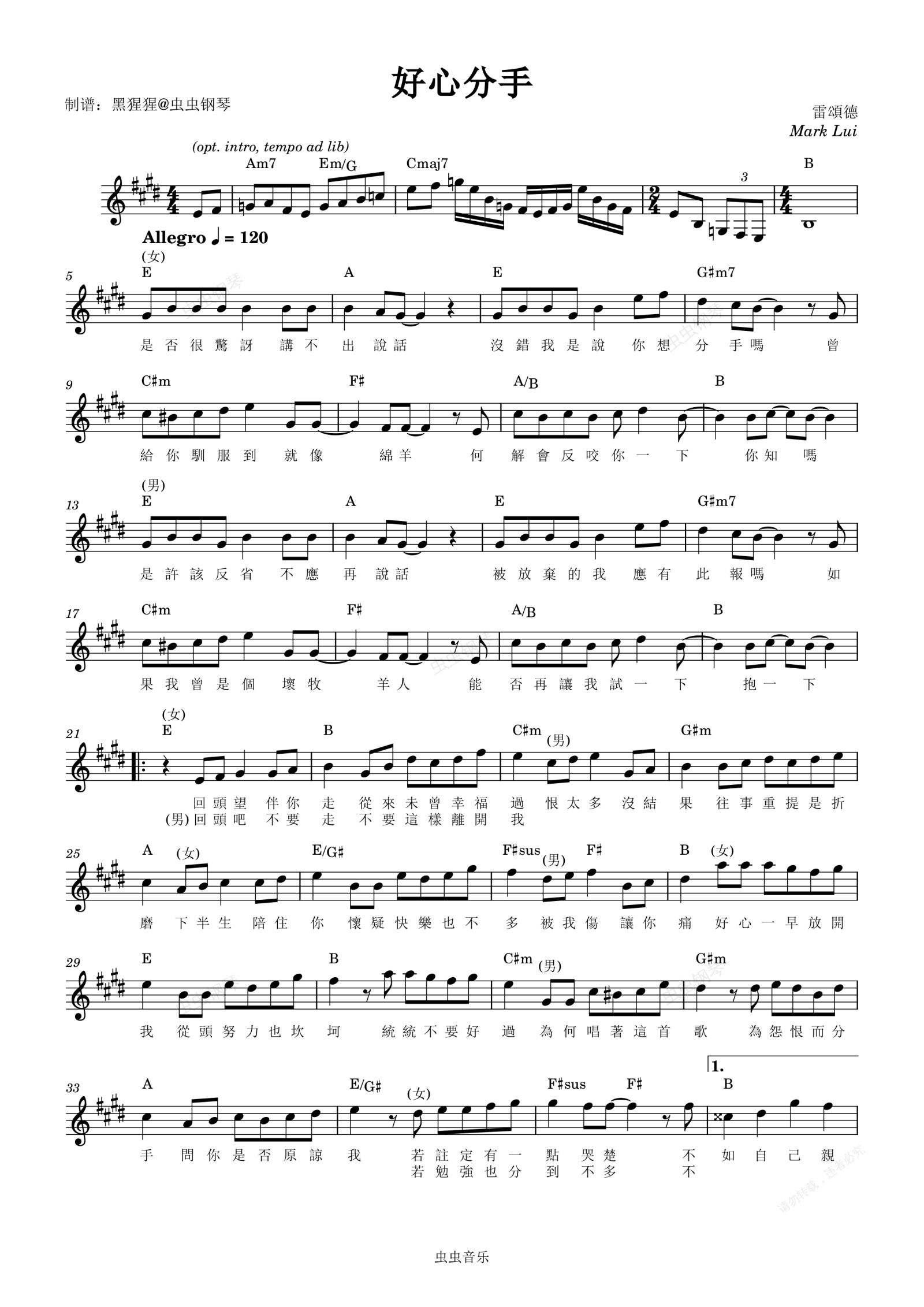 钢琴谱:王力宏、卢巧音-E调 《好心分手合唱版本》【带歌词】
