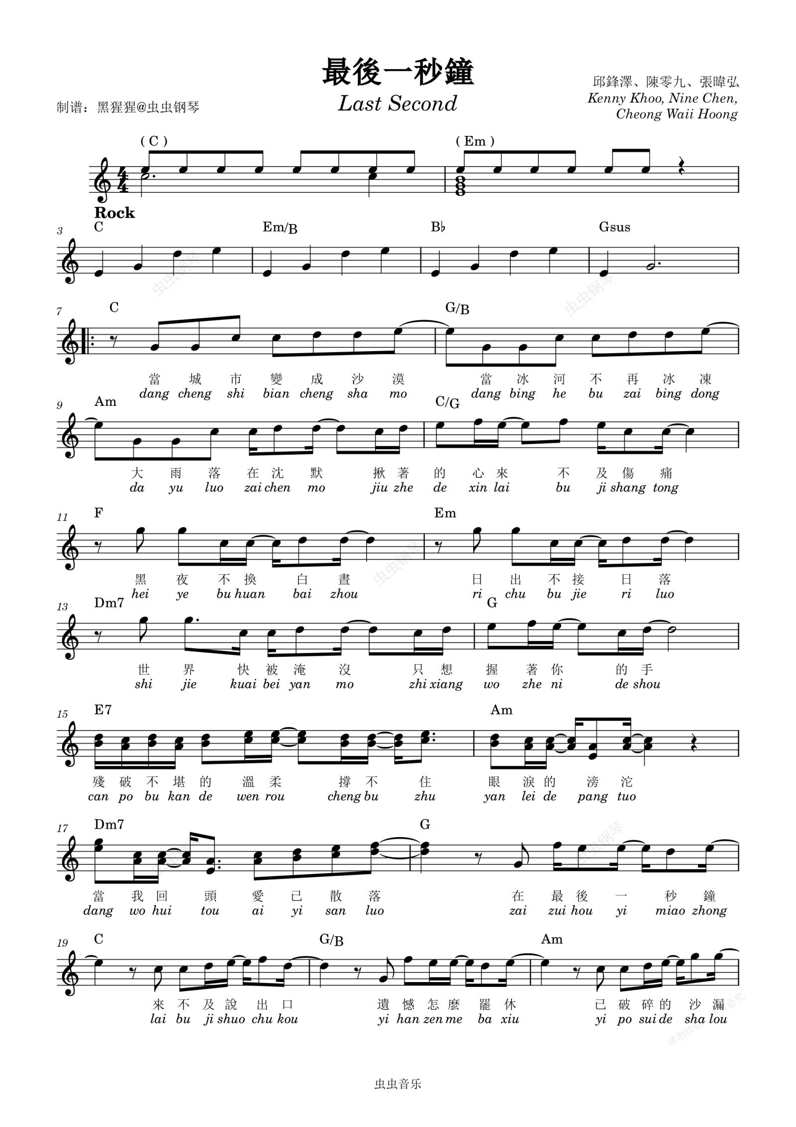 钢琴谱:九澤CP-C调 《最后一秒钟》【带歌词】