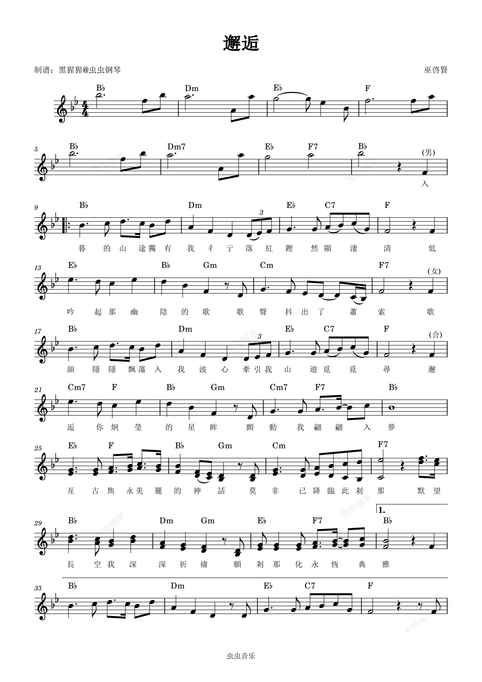 钢琴谱:巫启贤、黄譓赪-Bb调 《邂逅》【带歌词】