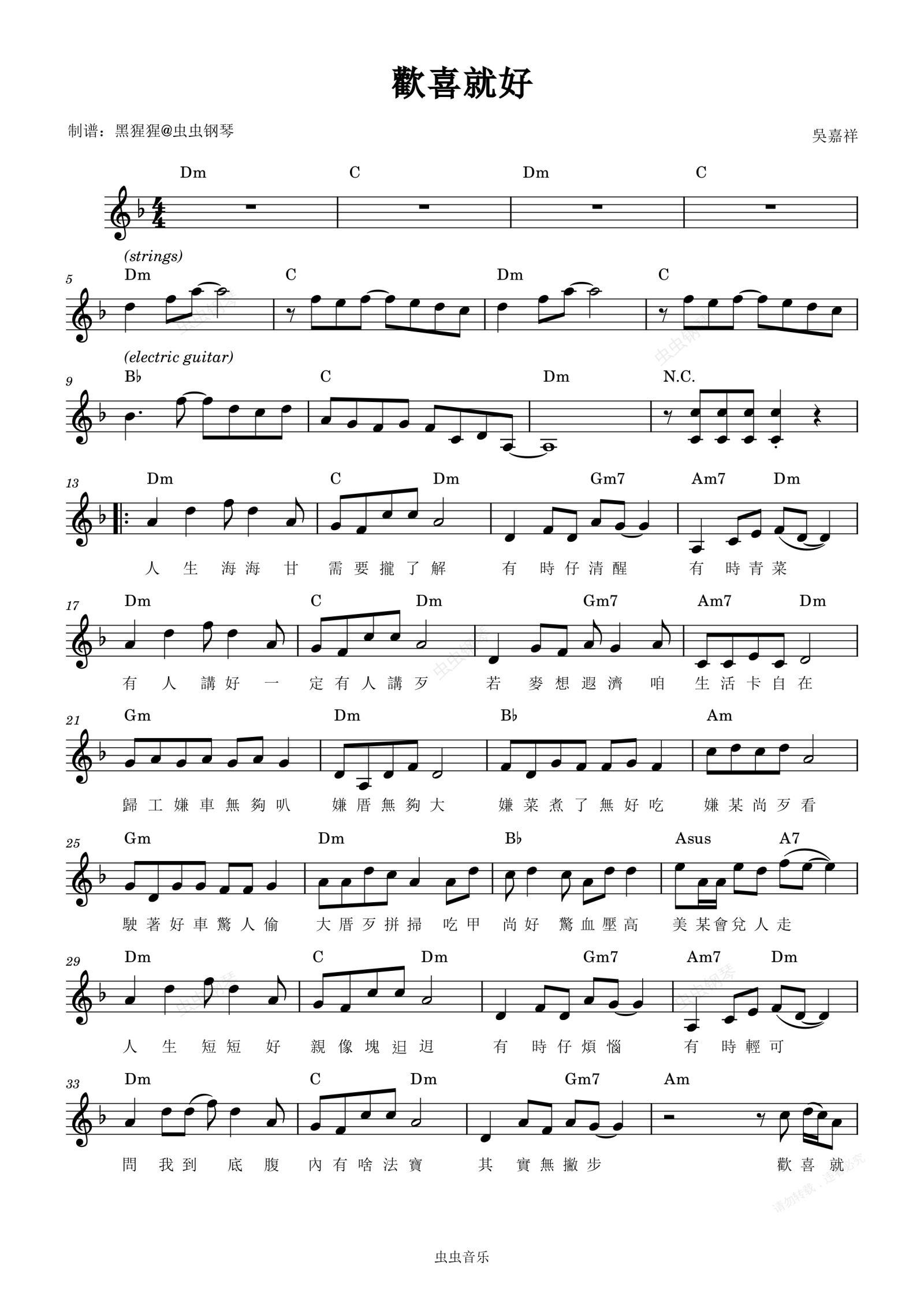 钢琴谱:陈雷-F调 《欢喜就好》【带歌词】