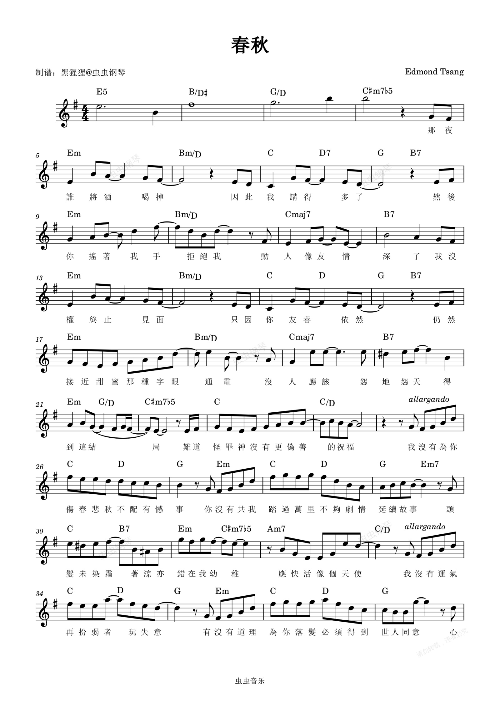 钢琴谱:张敬轩-G调 《春秋》【带歌词】