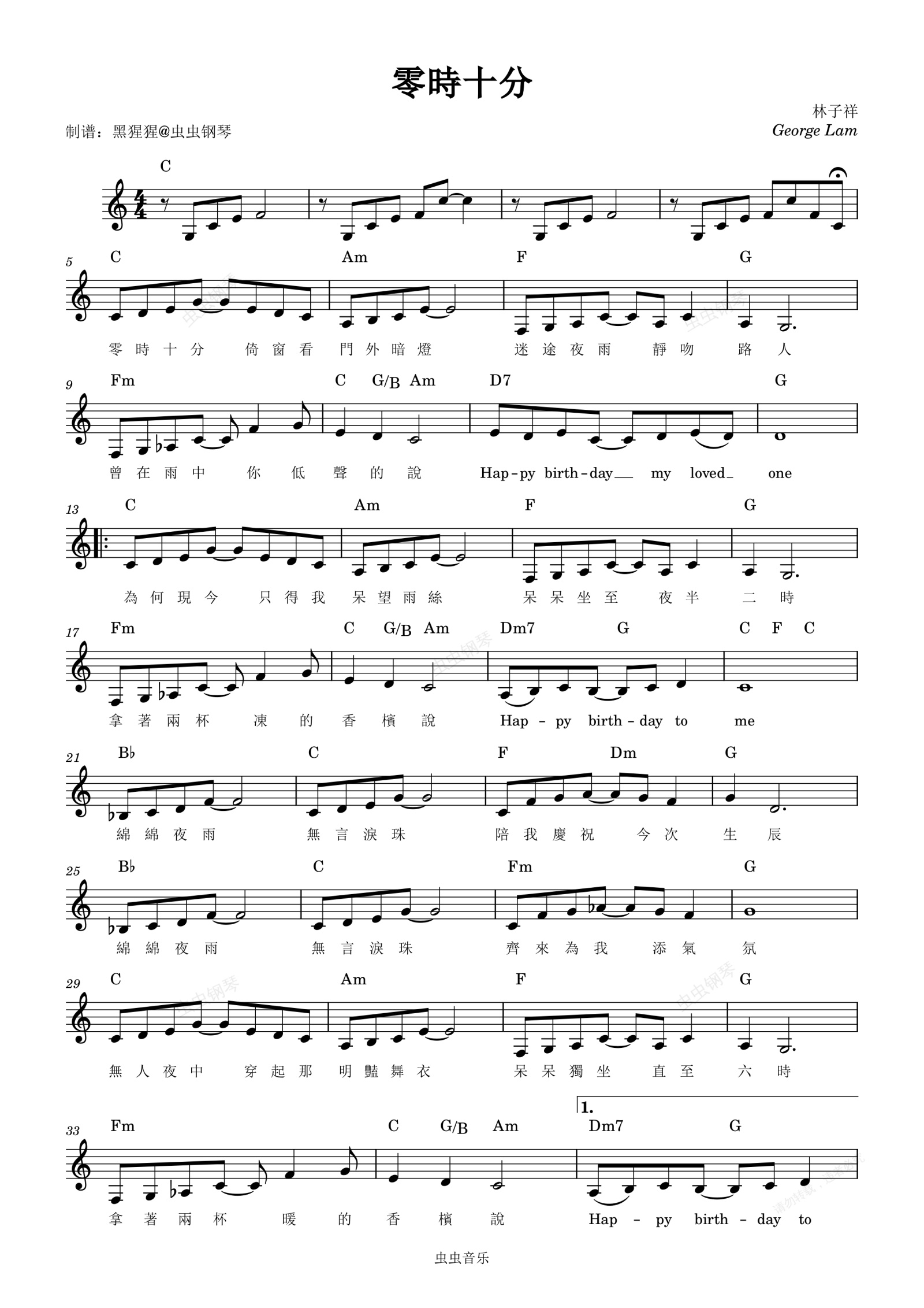 钢琴谱:叶倩文-C调 《零时十分》【带歌词】