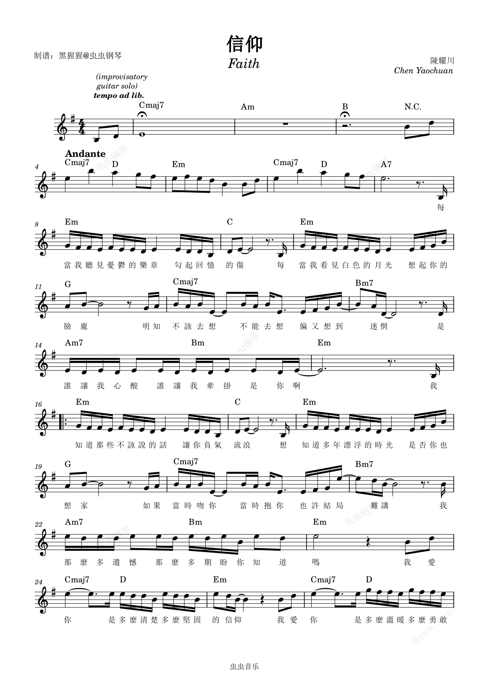 钢琴谱:张信哲-G调 《信仰》【带歌词】
