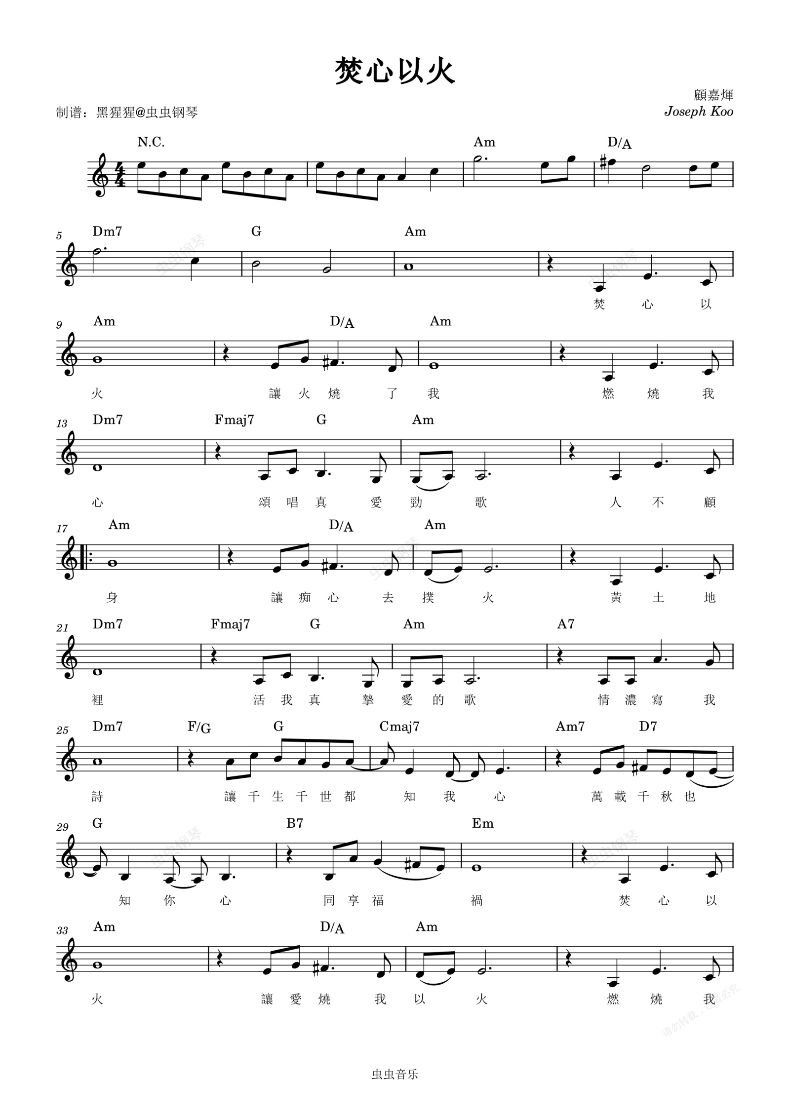 钢琴谱:叶倩文-C调 《焚心以火》【带歌词】