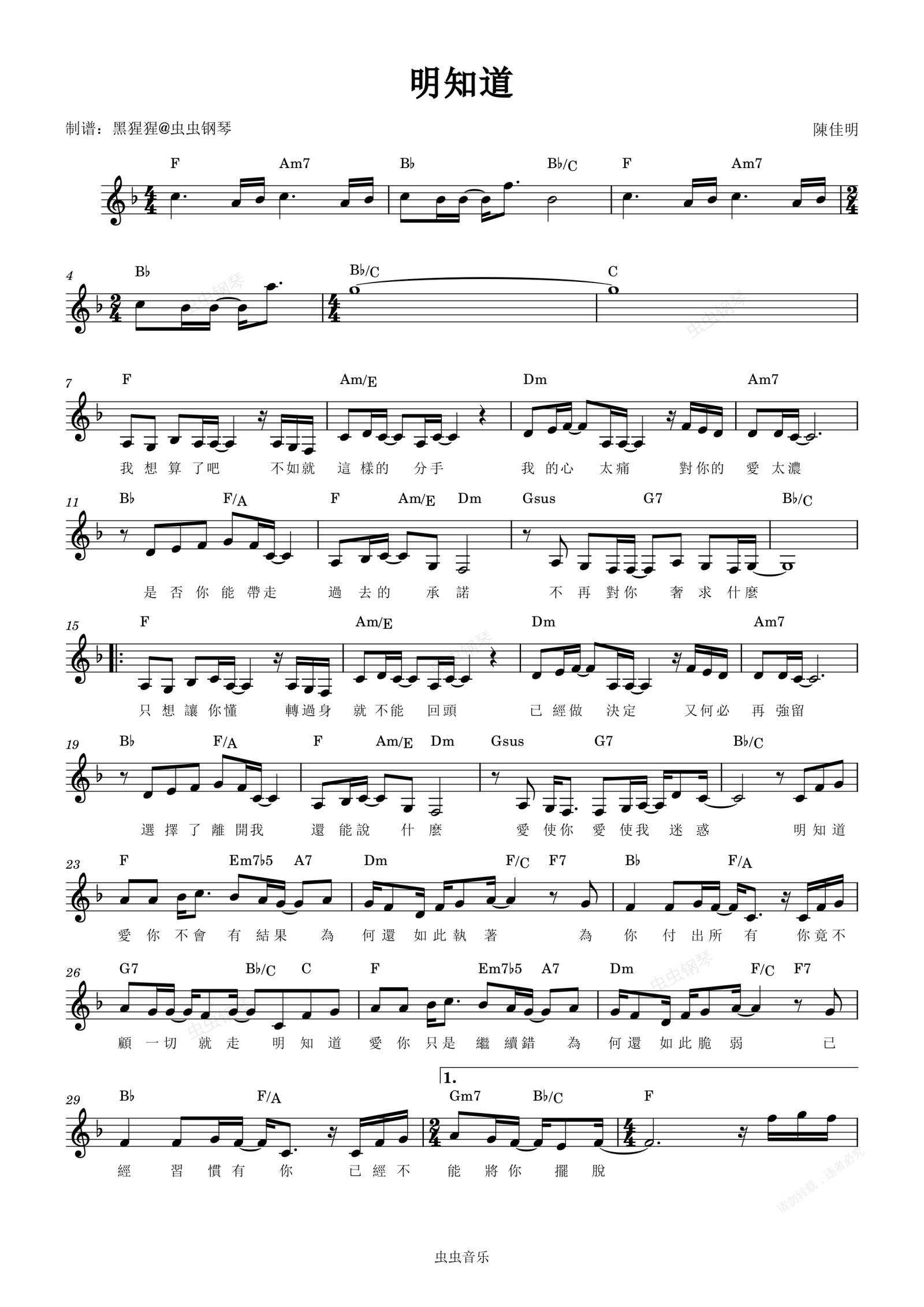 钢琴谱:许美静-F调 《明知道》【带歌词】