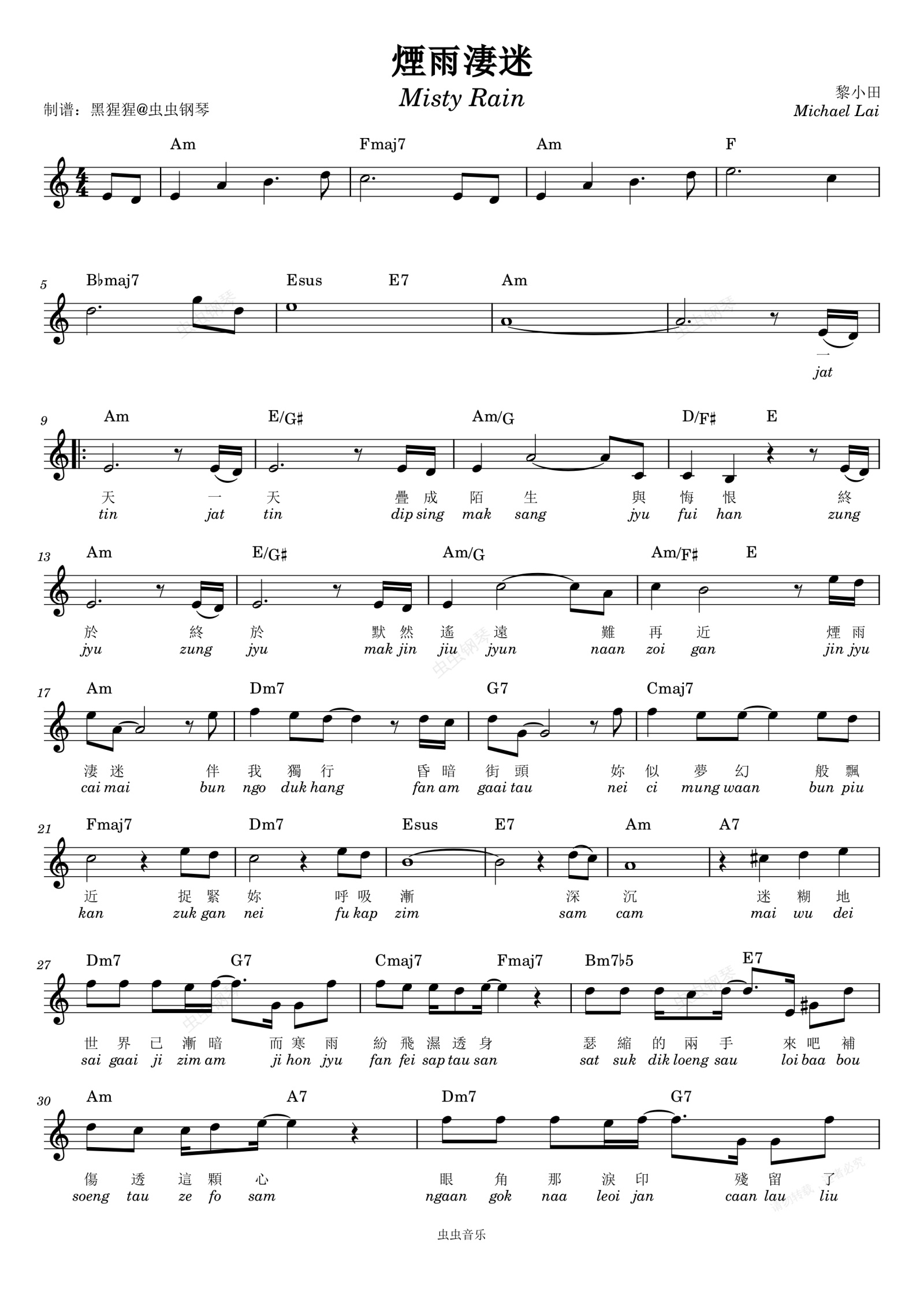 钢琴谱:陈百强-C调 《烟雨凄迷》【带歌词】