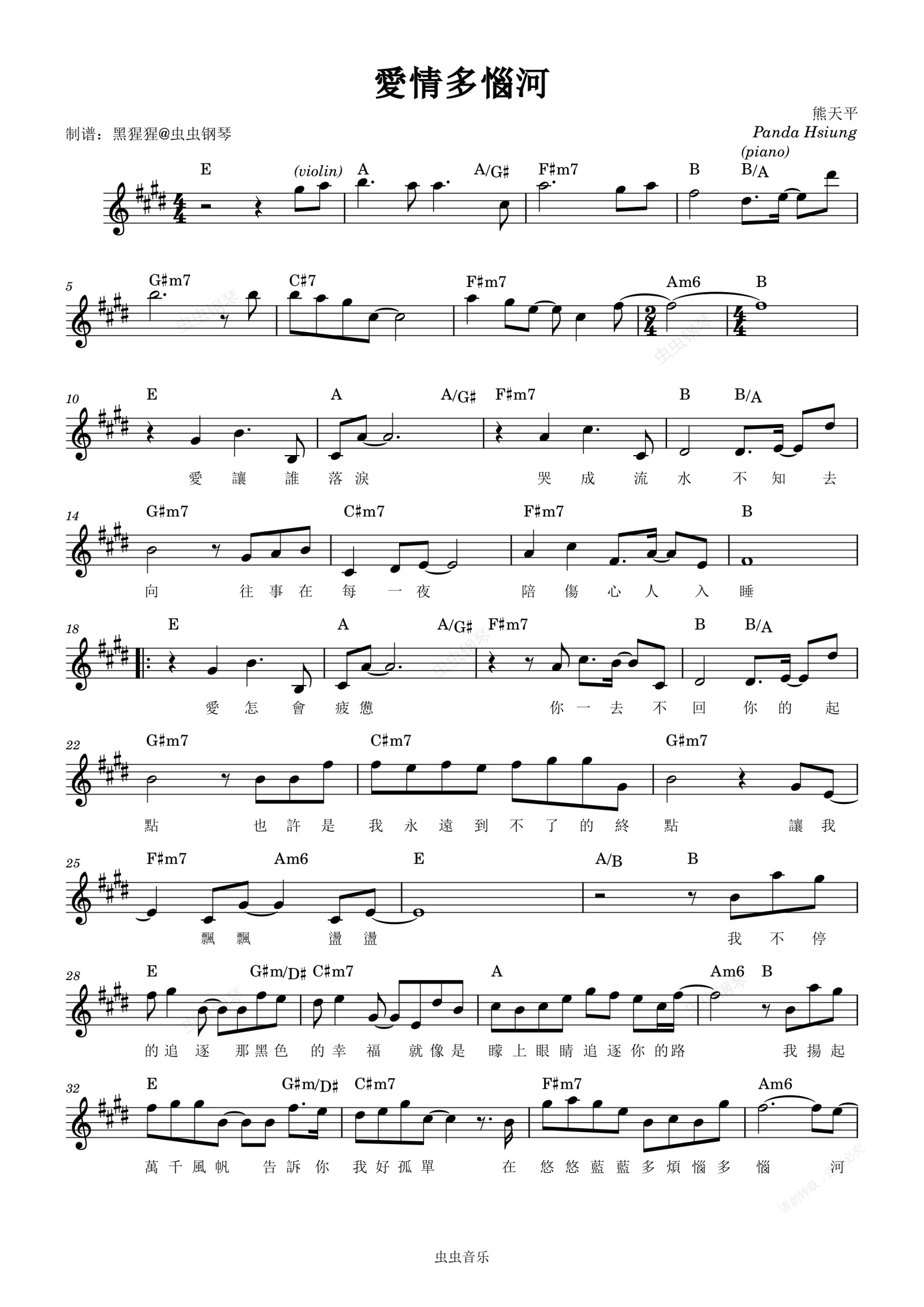 钢琴谱:熊天平-E调 《爱情多恼河》【带歌词】