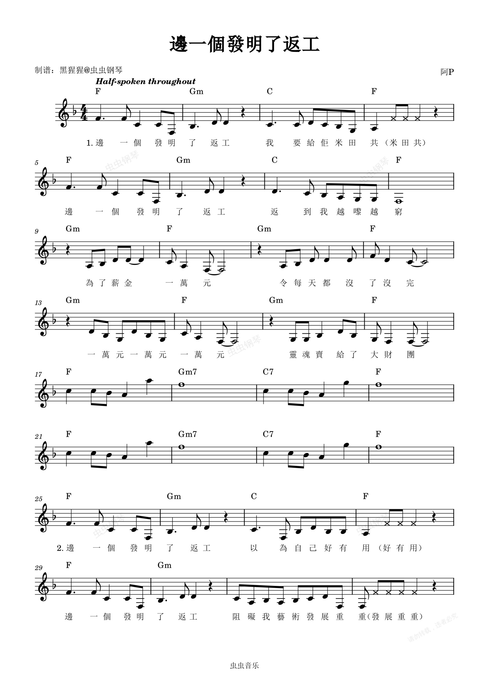 钢琴谱:my little airport-F调 《边一个发明了返工》【带歌词】