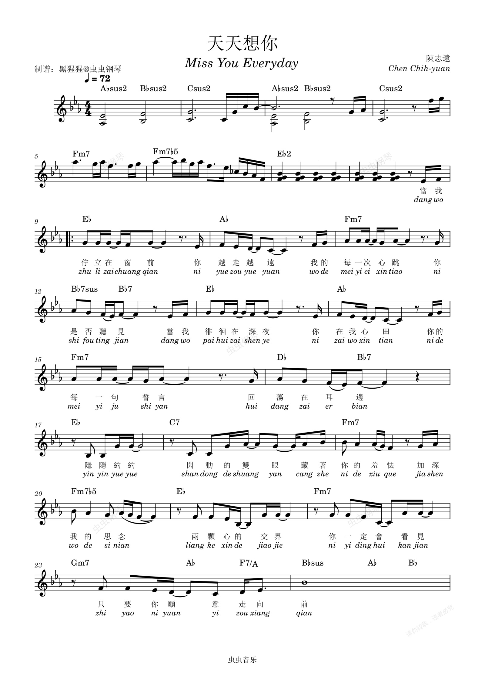 钢琴谱:張雨生-Eb调 《天天想你》【带歌词】