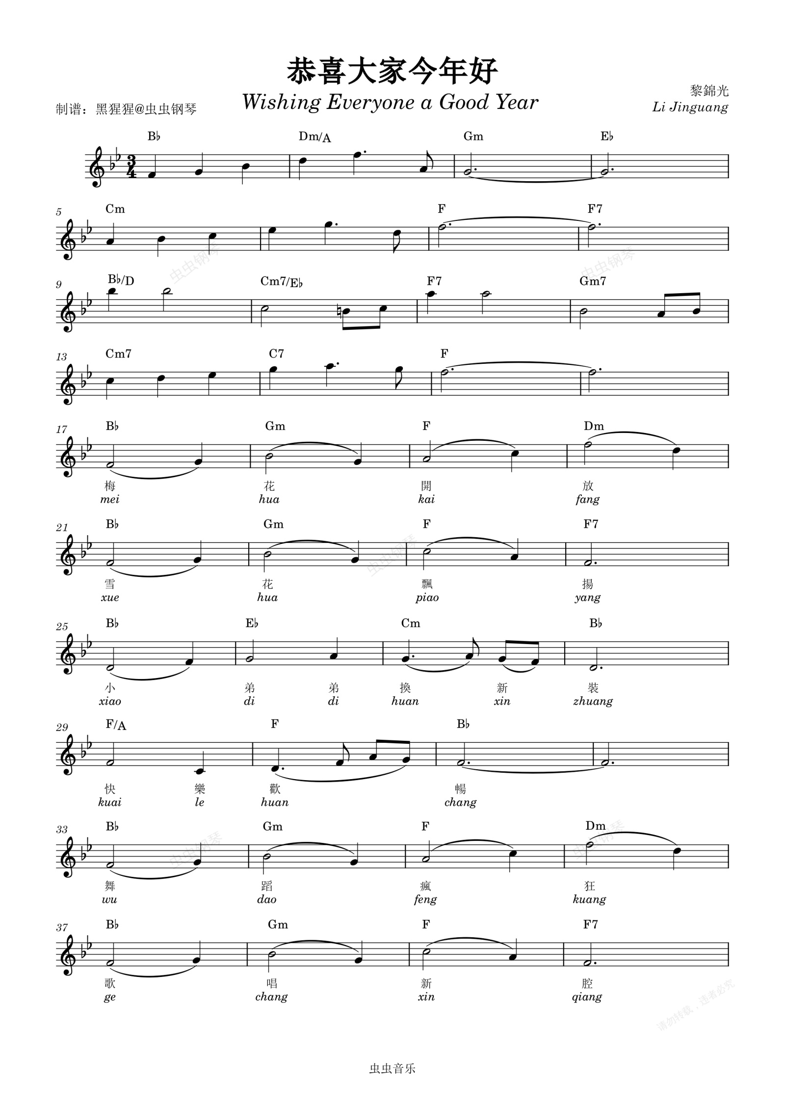 钢琴谱:Liang Ping-Bb调 《恭喜大家今年好》【带歌词】