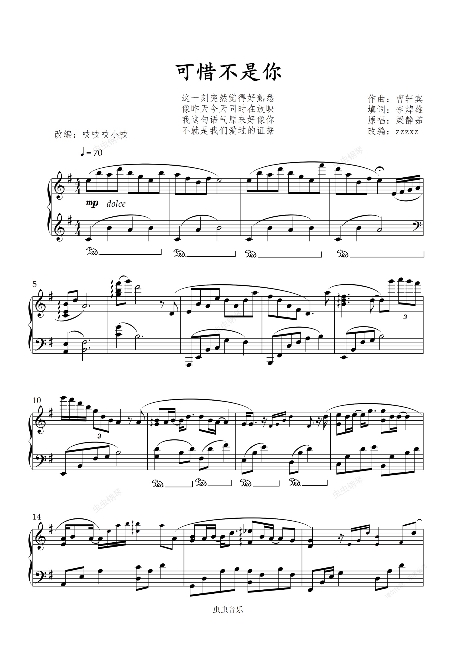 钢琴谱:可惜不是你-G-梁静茹 【中级难度】 吱吱编配