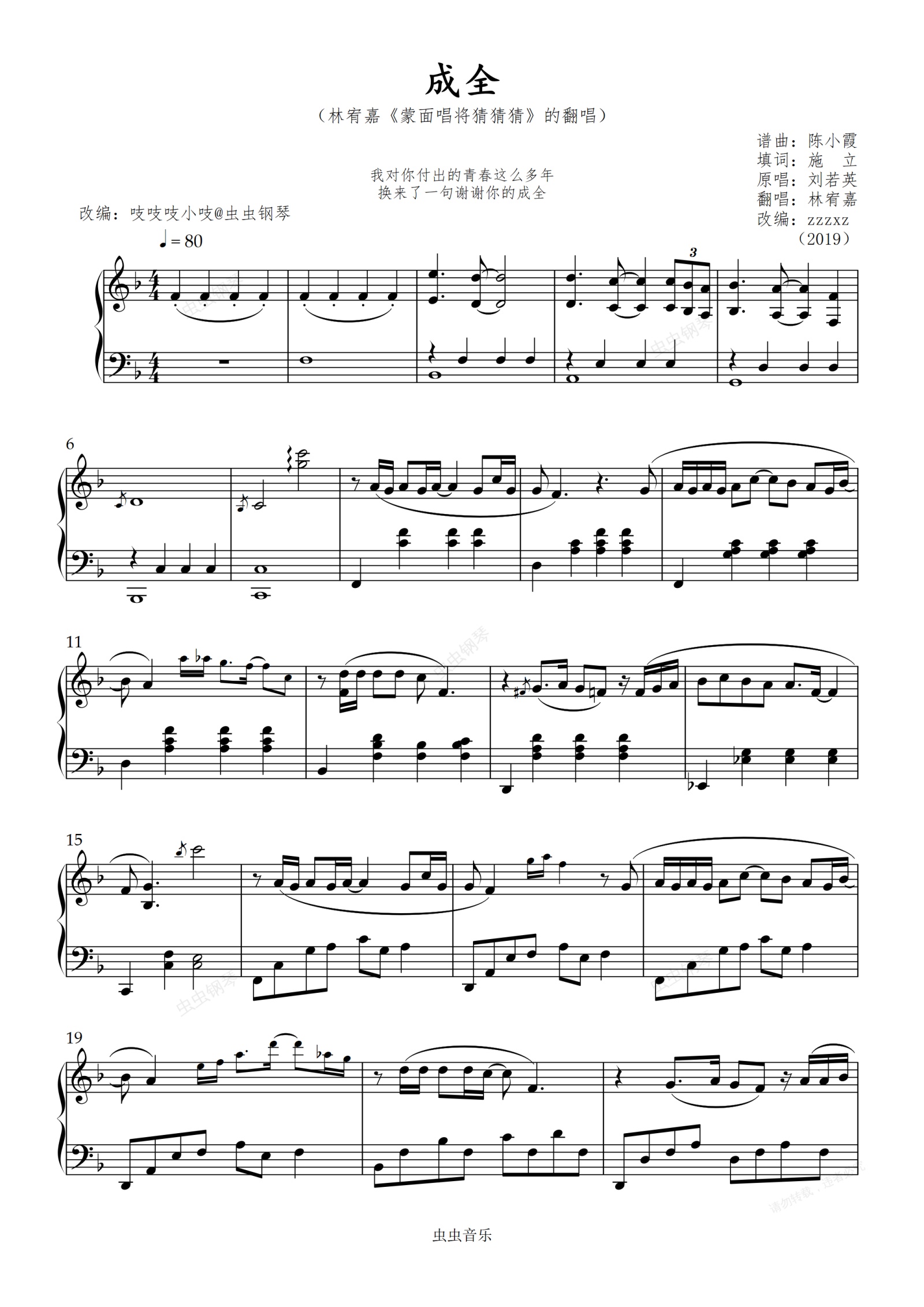 钢琴谱:成全-F-林宥嘉 【中级难度】 原调完整演奏 吱吱编配